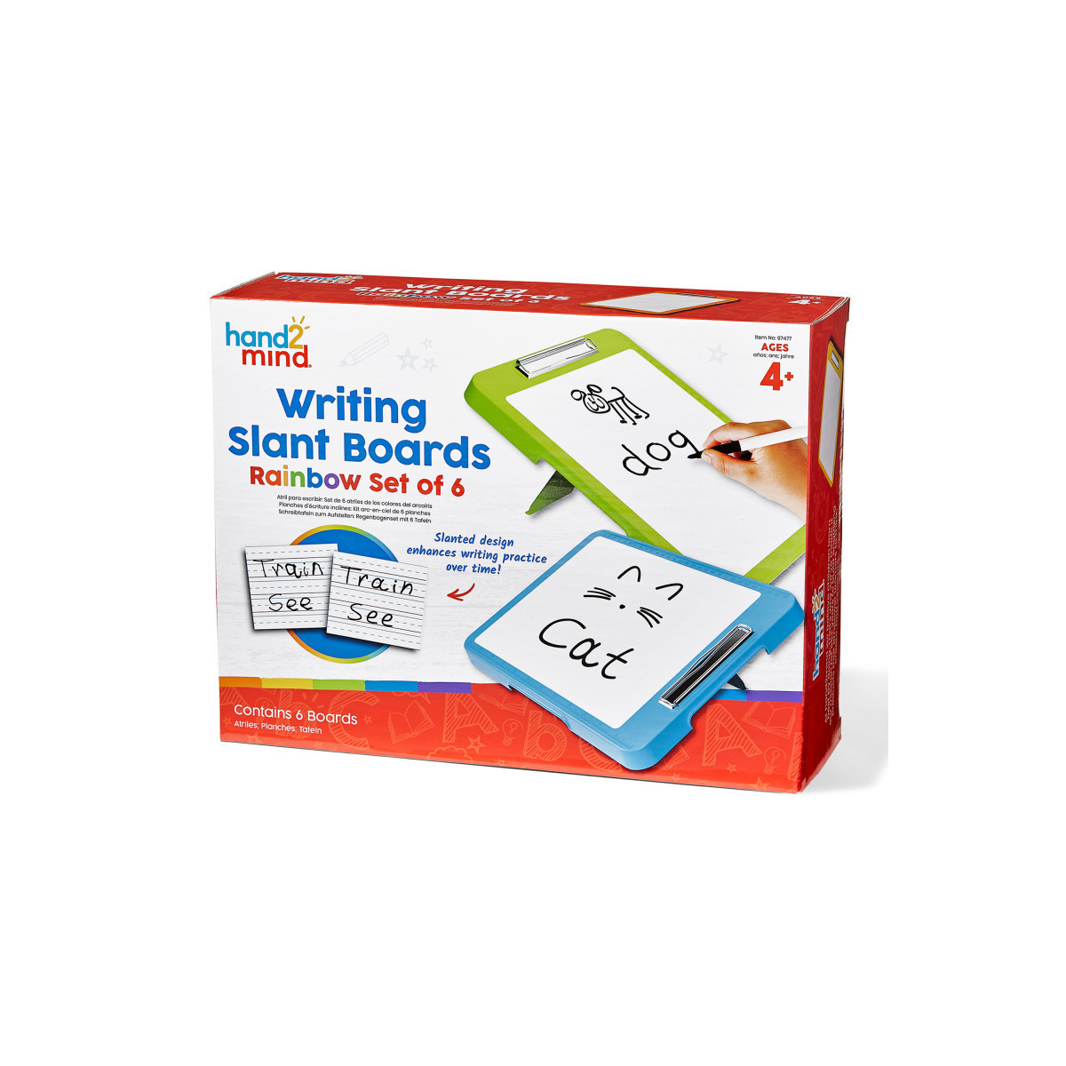 Add a splash of color to your classroom with this ergonomically designed writing surface! These rainbow-colored slant boards encourage proper posture, minimizing strain and fatigue during writing activities. Developed to support posture, the slanted design enhances writing practice, builds writing proficiency, and enhances letter formation and handwriting over time. Designed with a write-on/wipe-off surface and a built-in clipboard, these boards can be used horizontally and vertically. Easy-to-grip handles make the boards portable and convenient to use anywhere. Use the attached clip for paper or write directly on the dry-erase surface for endless writing practice! Sized to fit A4 and 8.5 x 11 paper in both orientations. Trays are stackable and easy-to-grip for convenient storage and comfortable handling. This set includes 6 Rainbow Writing Slant Boards.