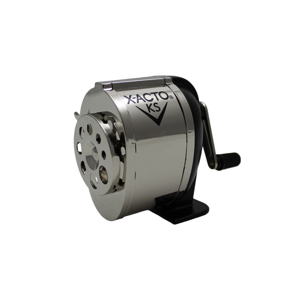The X-ACTO KS manual pencil sharpener is a traditionally styled pencil sharpener that mounts easily onto any horizontal or vertical surface. This KS manual pencil sharpener includes an 8-hole dial pencil selector. Able to stand up to continuous, heavy duty sharpening, this crank pencil sharpener makes a great addition to a workshop desk or table. The KS model features a brilliant metal finish.