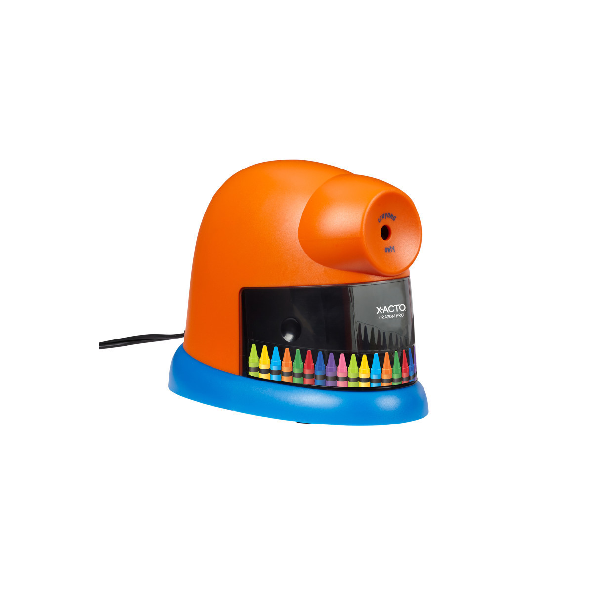 Sharpen crayons quickly and easily with X-ACTO's Crayon Pro Electric Crayon Sharpener. The crayon sharpener automatically peels back each crayons' paper cover and returns each crayon tip to its original shape. With a unique cutting mechanism, extra blade cartridge, and convenient cleaning brush to remove buildup, the automatic sharpener includes everything you need to keep standard-sized crayons in great shape.
