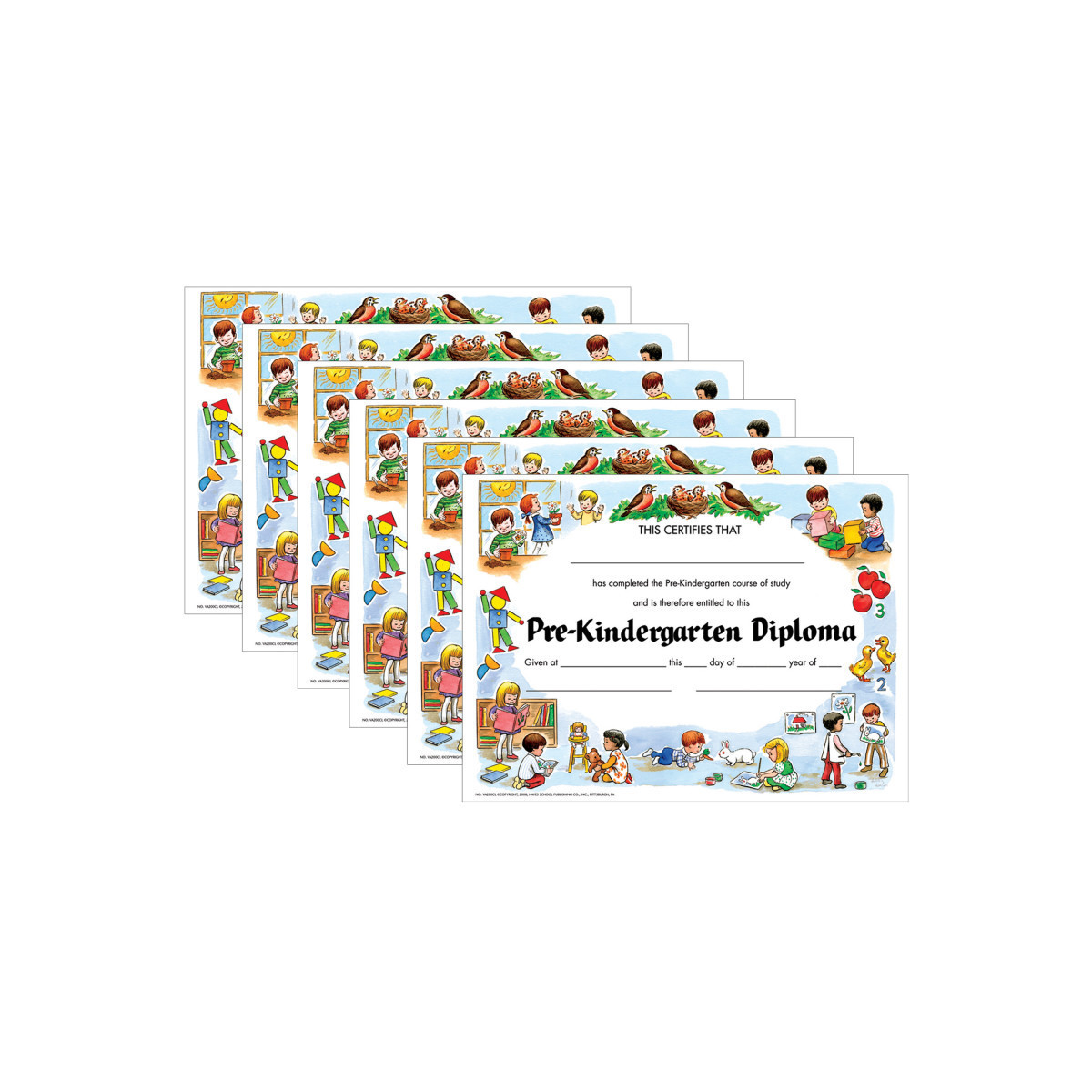 Pre-Kindergarten Diploma are awarded to students for completing their course of study. Authentic Hayes certificates which feature our primary border. Printed in full color and on high quality paper. The diplomas are great to give out at graduations. Feature our classic style design. Diplomas measure 8.5" x 11". Each pack includes 30 certificates. Sold as 6 packs for a total of 180 diplomas.