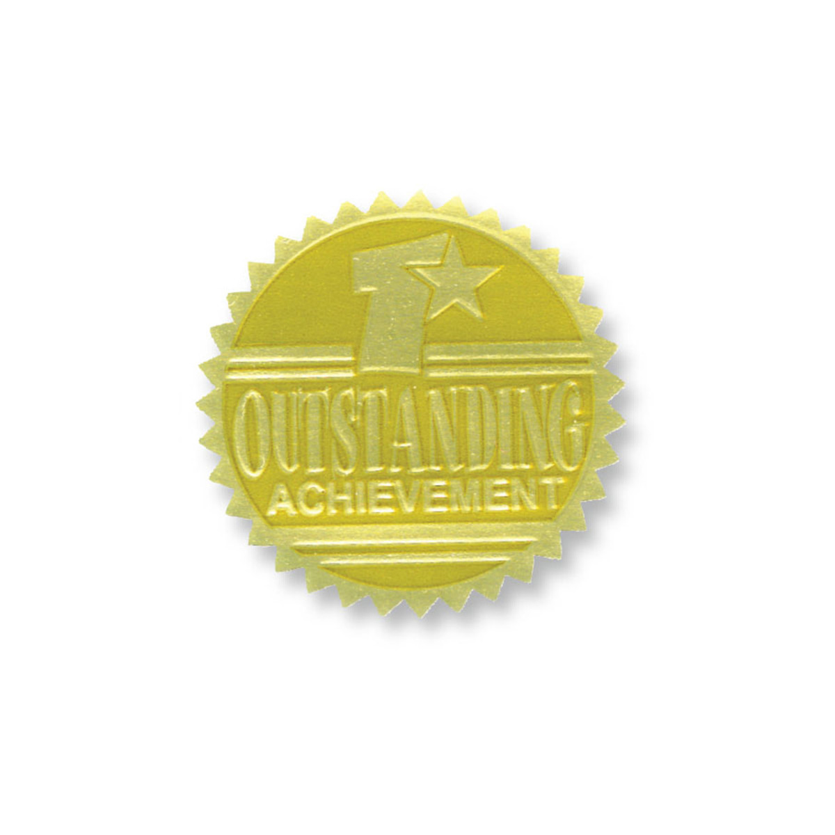 Outstanding Achievement Gold Foil Embossed Certificate Seals are gold foil embossed certificate seals add an extra touch of class to any certificate, award or diploma! Embossed with Outstanding Achievement and decorated with a #1 and a star for that special day. Also great for prizes and bulletin boards. Ideal for any Hayes award, certificate or diploma. Measures 1 3/4" diameter. Each pack includes 54 self-adhesive seals.