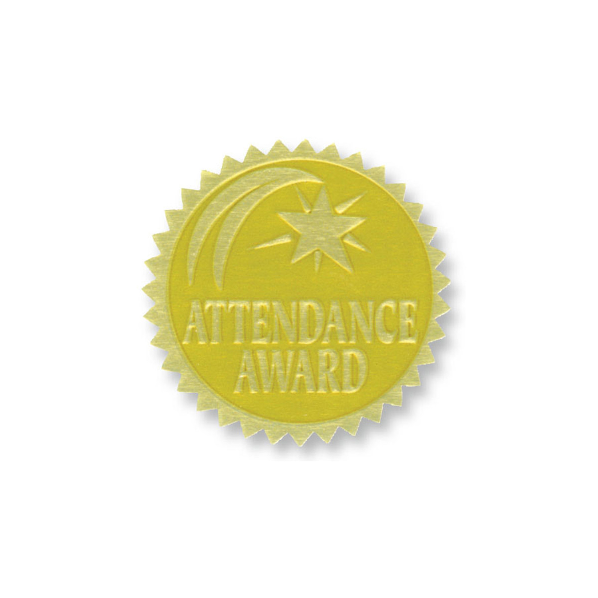 Attendance Award Gold Foil Embossed Certificate Seals are gold foil embossed certificate seals add an extra touch of class to any certificate, award or diploma! Embossed with Attendance Award surrounded by a shooting star for that special day. Also great for prizes and bulletin boards. Ideal for any Hayes award, certificate or diploma. Measures 1 3/4" diameter. Each pack includes 54 self-adhesive seals.