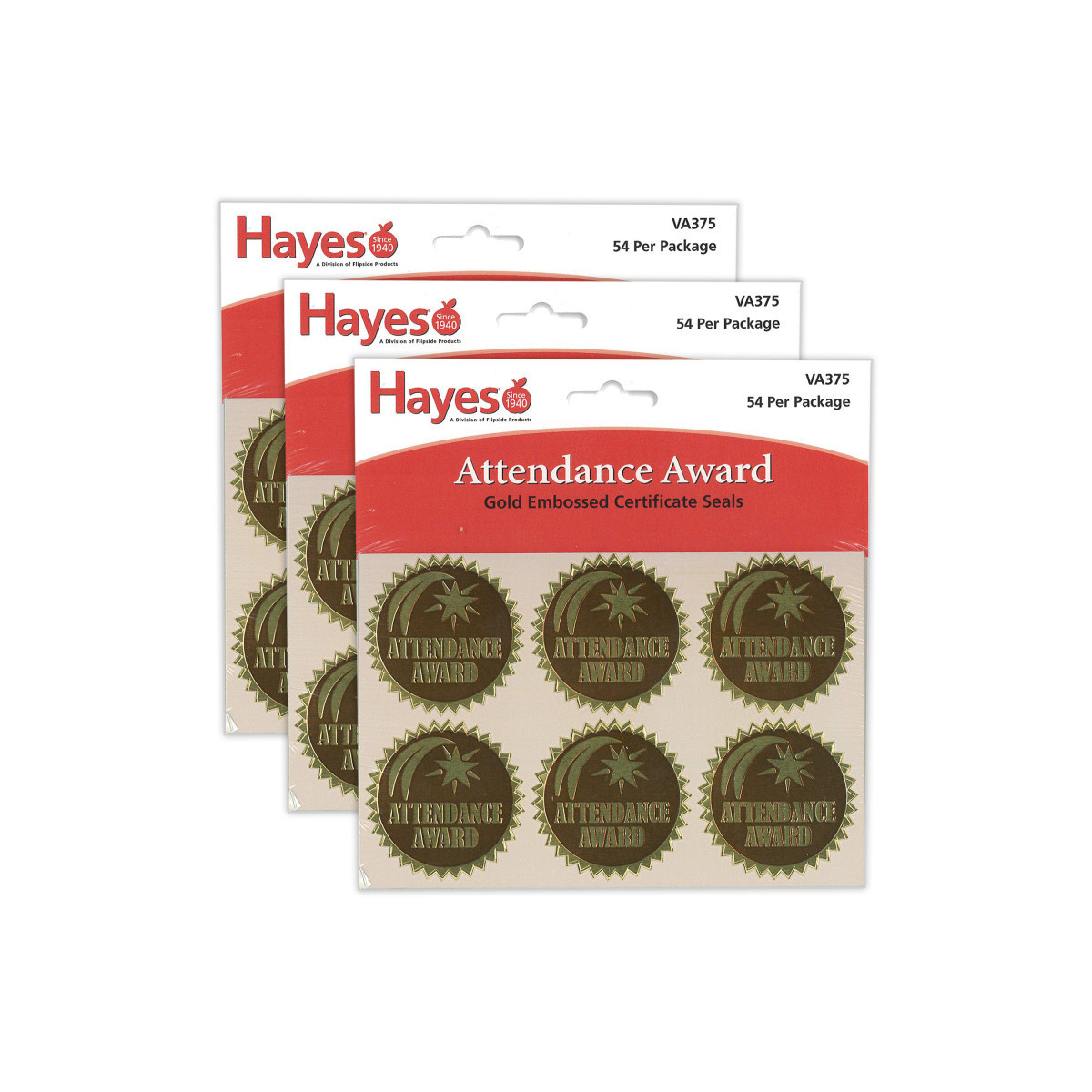 Attendance Award Gold Foil Embossed Certificate Seals are gold foil embossed certificate seals add an extra touch of class to any certificate, award or diploma! Embossed with Attendance Award surrounded by a shooting star for that special day. Also great for prizes and bulletin boards. Ideal for any Hayes award, certificate or diploma. Measures 1 3/4" diameter. Each pack includes 54 self-adhesive seals. Sold as 3 packs for a total of 162 seals.