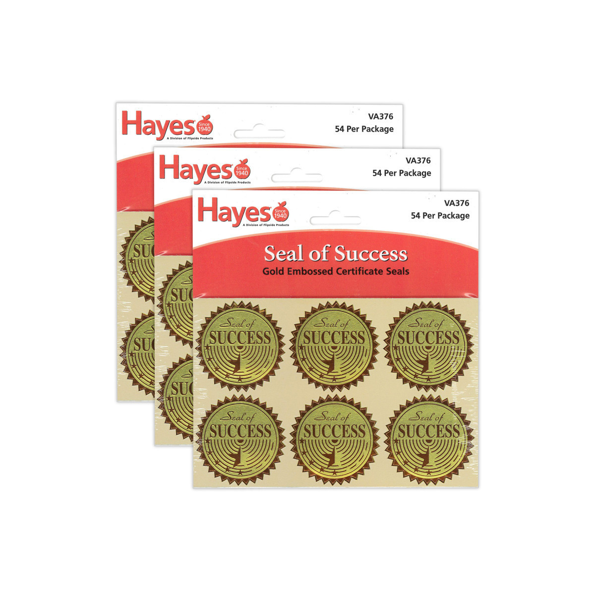 Seal of Success Gold Foil Embossed Certificate Seals are gold foil embossed certificate seals add an extra touch of class to any certificate, award or diploma! Embossed with Seal of Success resting on top of a field of stars for that special day. Also great for prizes and bulletin boards. Ideal for any Hayes award, certificate or diploma. Measures 1 3/4" diameter. Each pack includes 54 self-adhesive seals. Sold as 3 packs for a total of 162 seals.