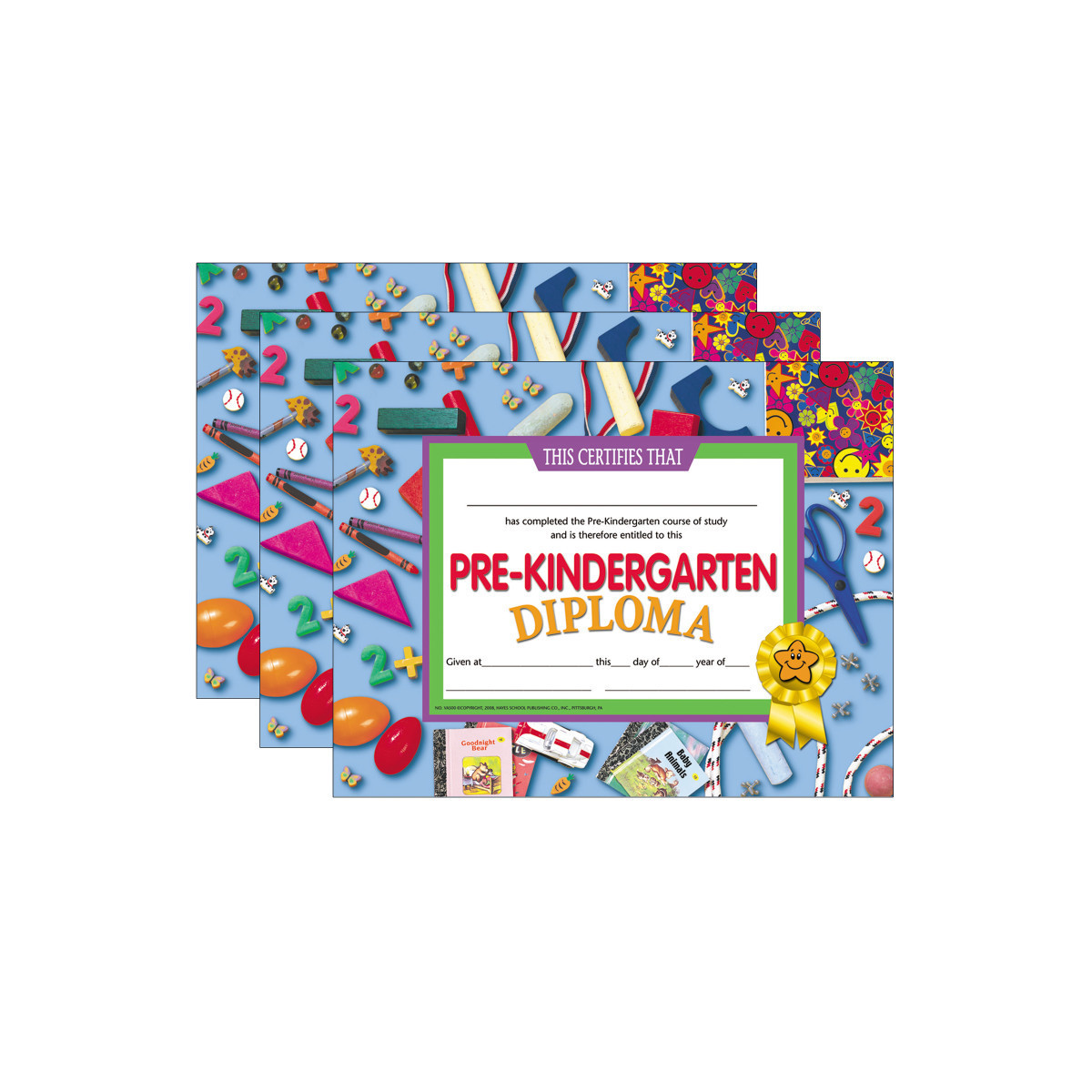 Pre-Kindergarten Diplomas are great for graduations! They will become a keepsake from that special day for years to come for both the parents and students. Diplomas are a great way to congratulate students for completing the year. Compatible with most laser printers. They are beautiful designed Hayes diplomas which are printed in high quality color and stock paper. They can either be handwritten or printed with a downloadable template! Measures 8.5" x 11". Each pack includes 30 diplomas. Sold as 3 packs for a total of 90 diplomas.
