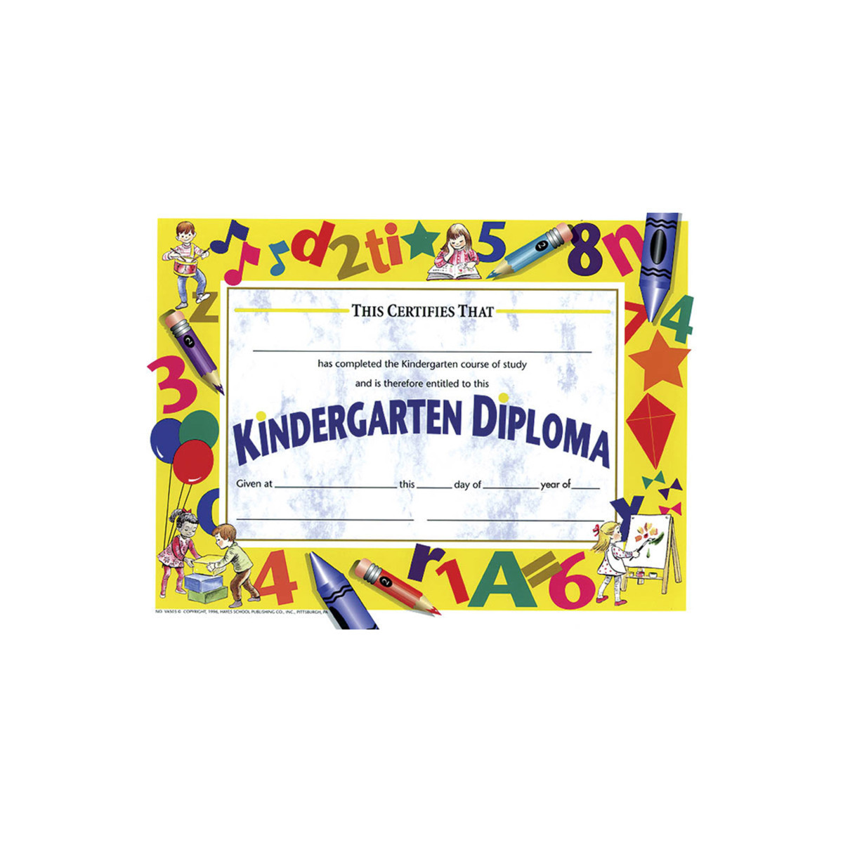 Diploma reads: This Certifies That _____ has completed the Kindergarten course of study and is therefore entitled to this Kindergarten Diploma Given at _____ this _____ day of _____ year of _____. The diplomas can either be handwritten or printed with a downloadable template.