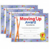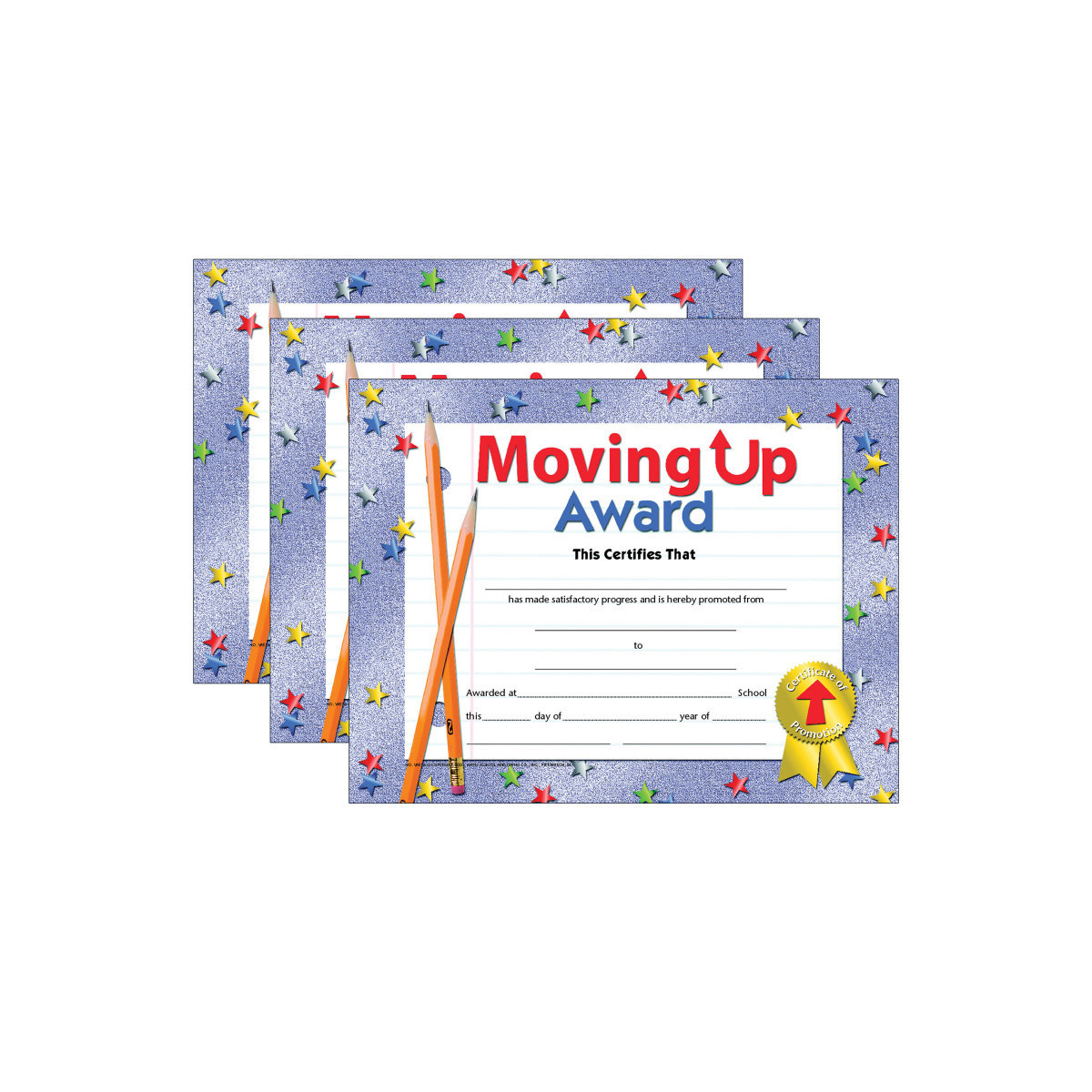 Certificate Reads: Moving Up Award This Certifies That _____ has made satisfactory progress and is hereby promoted from _____ to _____ Awarded at _____ School this _____ day of _____ year of _____. These certificates can personalized by handwriting them in or printing them. Downloadable template available online.