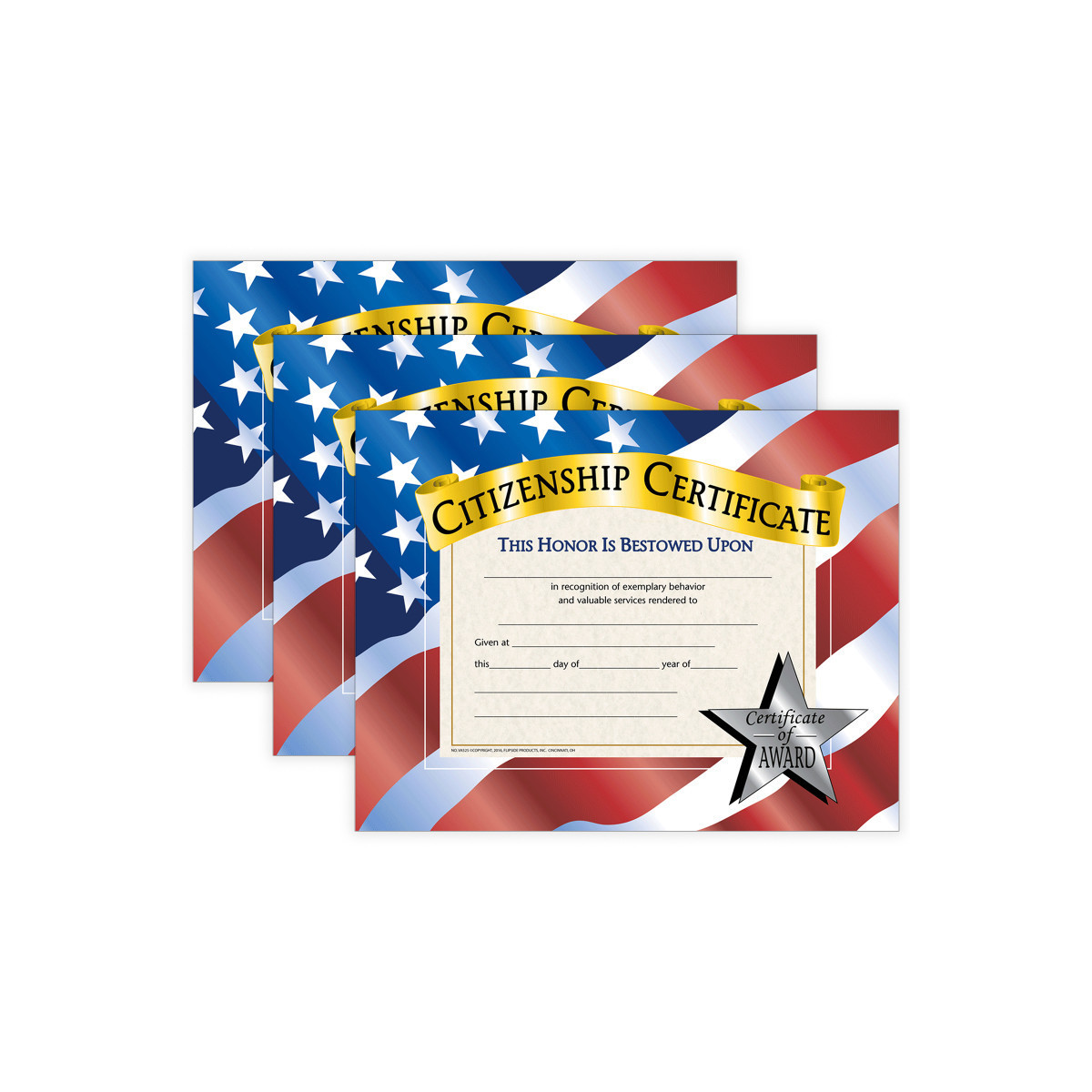 Citizenship Certificates are a great way to reward students for displaying good behavior and helping out other and with different tasks or activities. These blank certificates can be handwritten or printed to personalize with the recipients name and information about why they are receiving this award. Online template is available for download. Measures 8.5" x 11". Each pack includes 30 certificates. Sold as 3 packs for a total of 90 certificates.