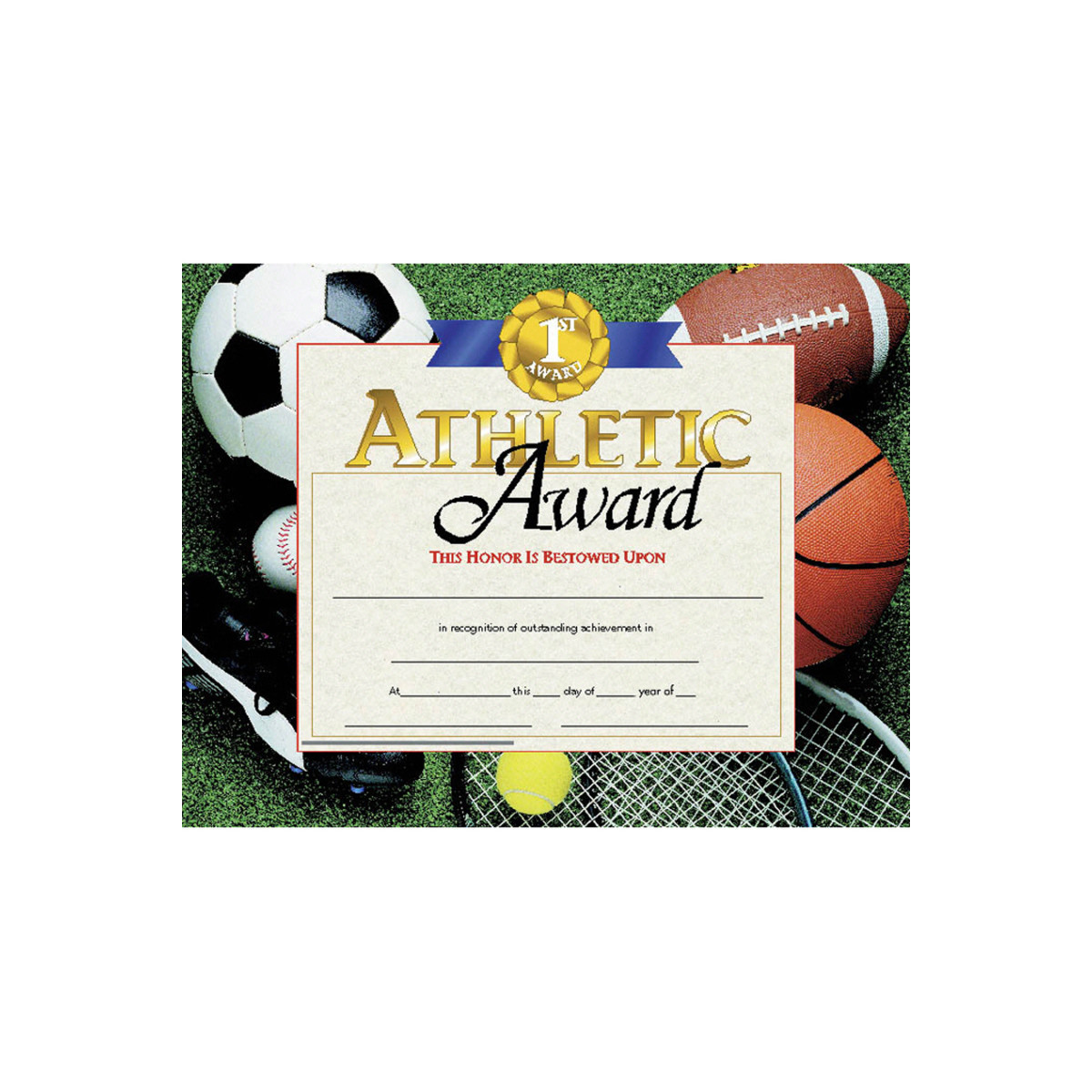 Certificate reads: Athletic Award This Honor Is Bestowed Upon _____ in recognition of outstanding achievement in _____ At _____ this _____ day of _____ year of _____. These blank certificates can be personalized with the recipients name and information regarding the award. They can be handwritten or printed with a downloadable template.