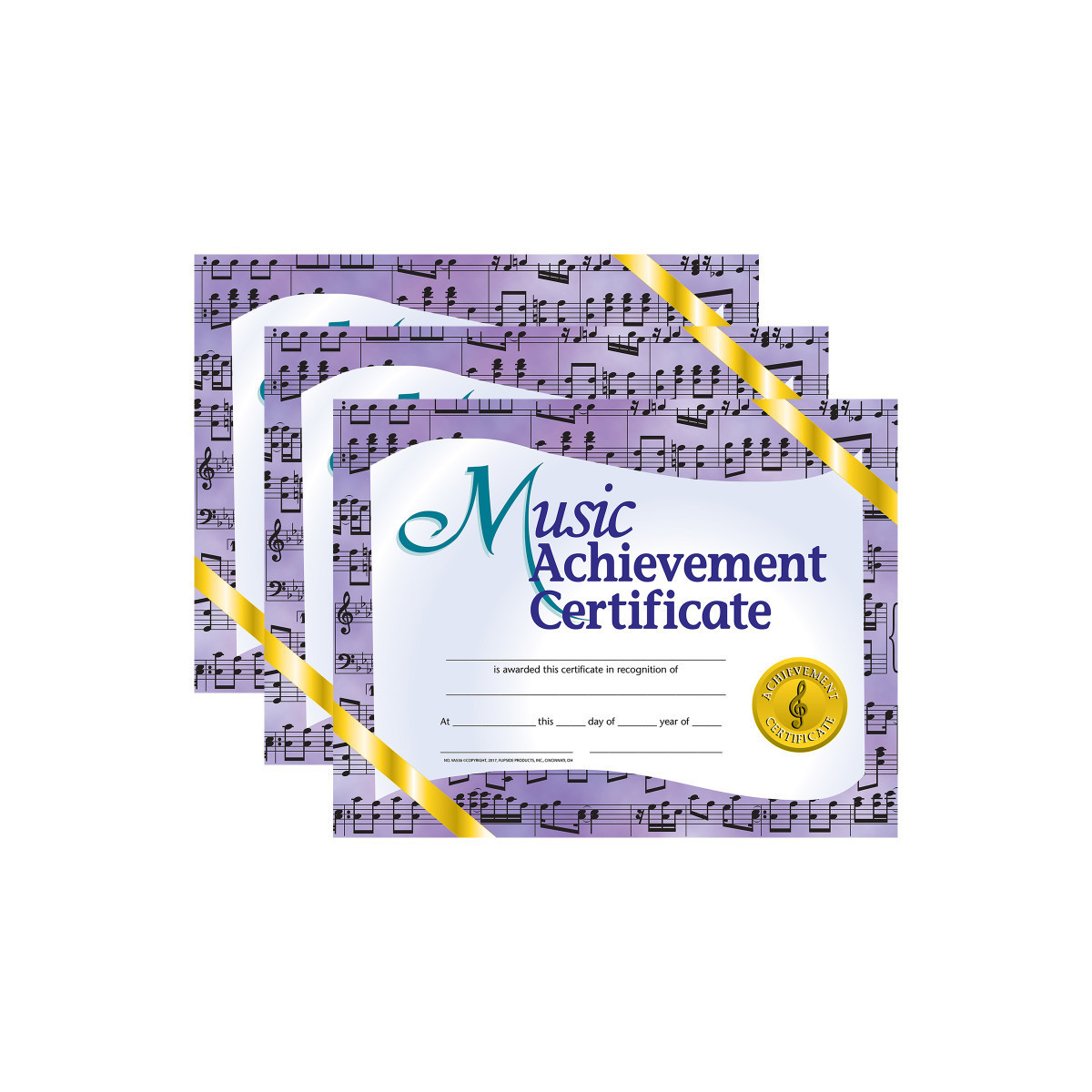 Music Achievement Certificates are for students who have shown hard work, dedication, or a high interest in music class. These certificates are beautifully designed Hayes certificates. They are printed in full color on high quality paper. These will become a keepsake for years to come. These music achievement award have a light purple, music staff background and gold ribbon going across the top right and bottom left hand corners. These blank achievement certificates can be personalized with a downloadable template. Measures 8.5" x 11". Each pack includes 30 diplomas. Sold as 3 packs, 90 diplomas total.