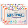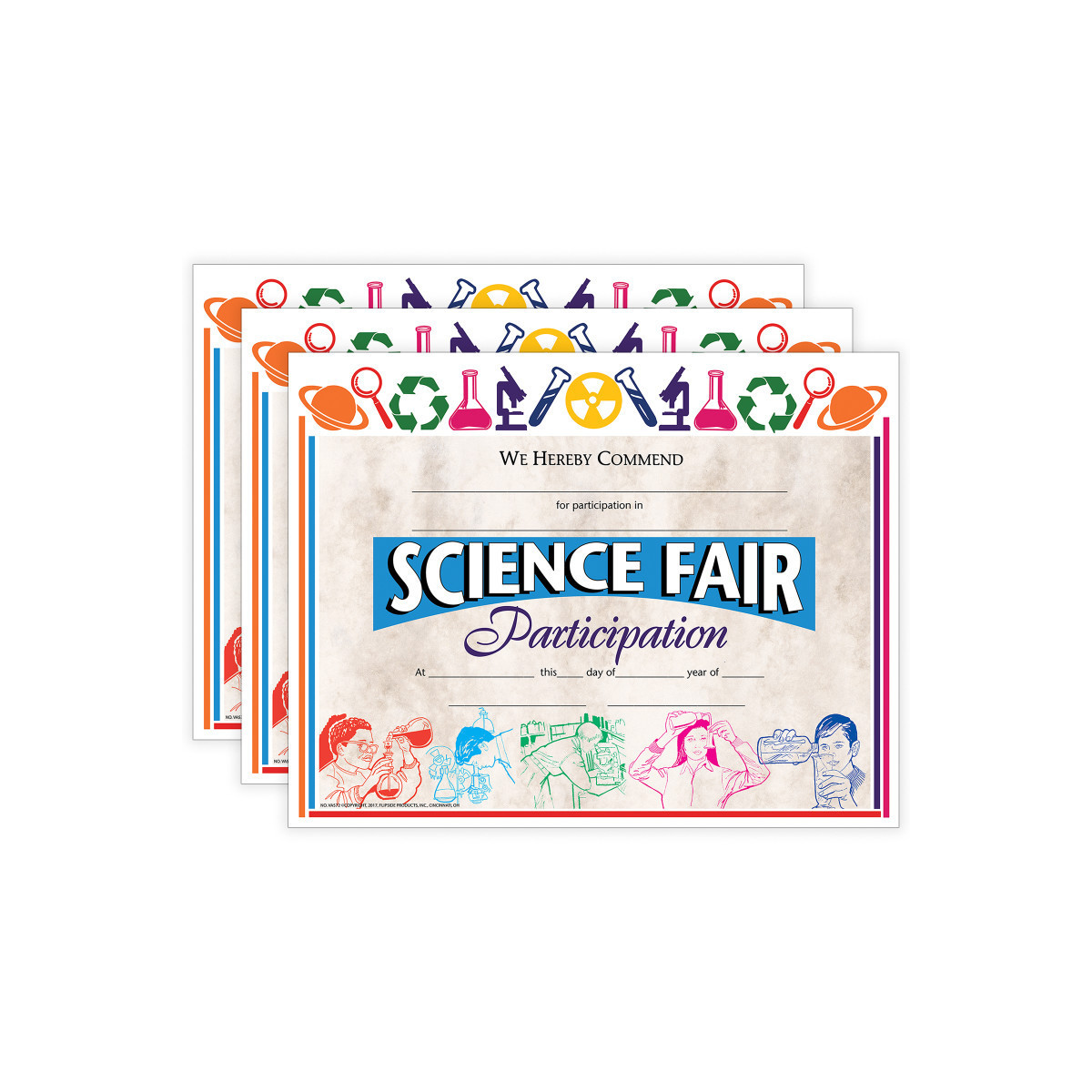 Science Fair Participation Certificates are given to students who created a display for the science fair. These beautiful Hayes certificates show images of science tools and different types of science experiments. These science fair certificates will be a keepsake for years to come. Certificates measure 8.5" x 11". Each pack includes 30 certificates. Sold as 3 packs for a total of 90 certificates.