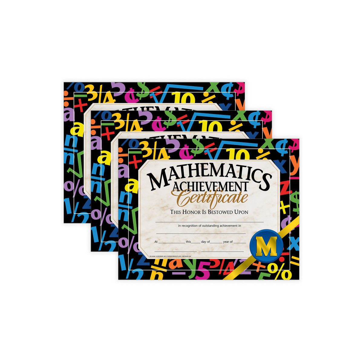 Mathematics Achievement Certificates are awarded to students who have shown outstanding work in math class. These Hayes certificates are beautifully designed with a black background that features different mathematical figures. These math awards are great to give out at end of the school year parties and award ceremonies. Beautiful, authentically designed Hayes certificates printed in full color on high quality paper, will become a keepsake from that special day for years to come. These blank math achievement awards can be personalized with the student's name and information regarding the award. They can be either handwritten or printed with a downloadable template. Measures 8.5" x 11". Each pack includes 30 certificates. Sold as 3 packs, 90 certificates total.