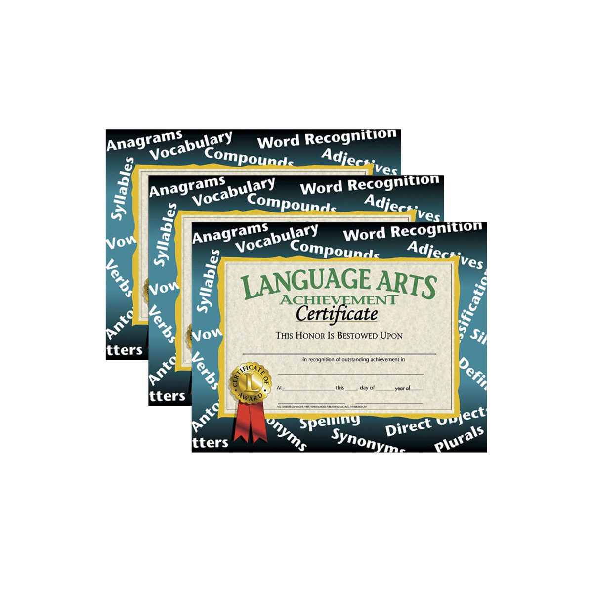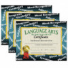 Certificate reads: Language Arts Achievement Certificate This Honor Is Bestowed Upon _____ in recognition of outstanding achievement in _____ At _____ this _____ day of _____ year of _____.