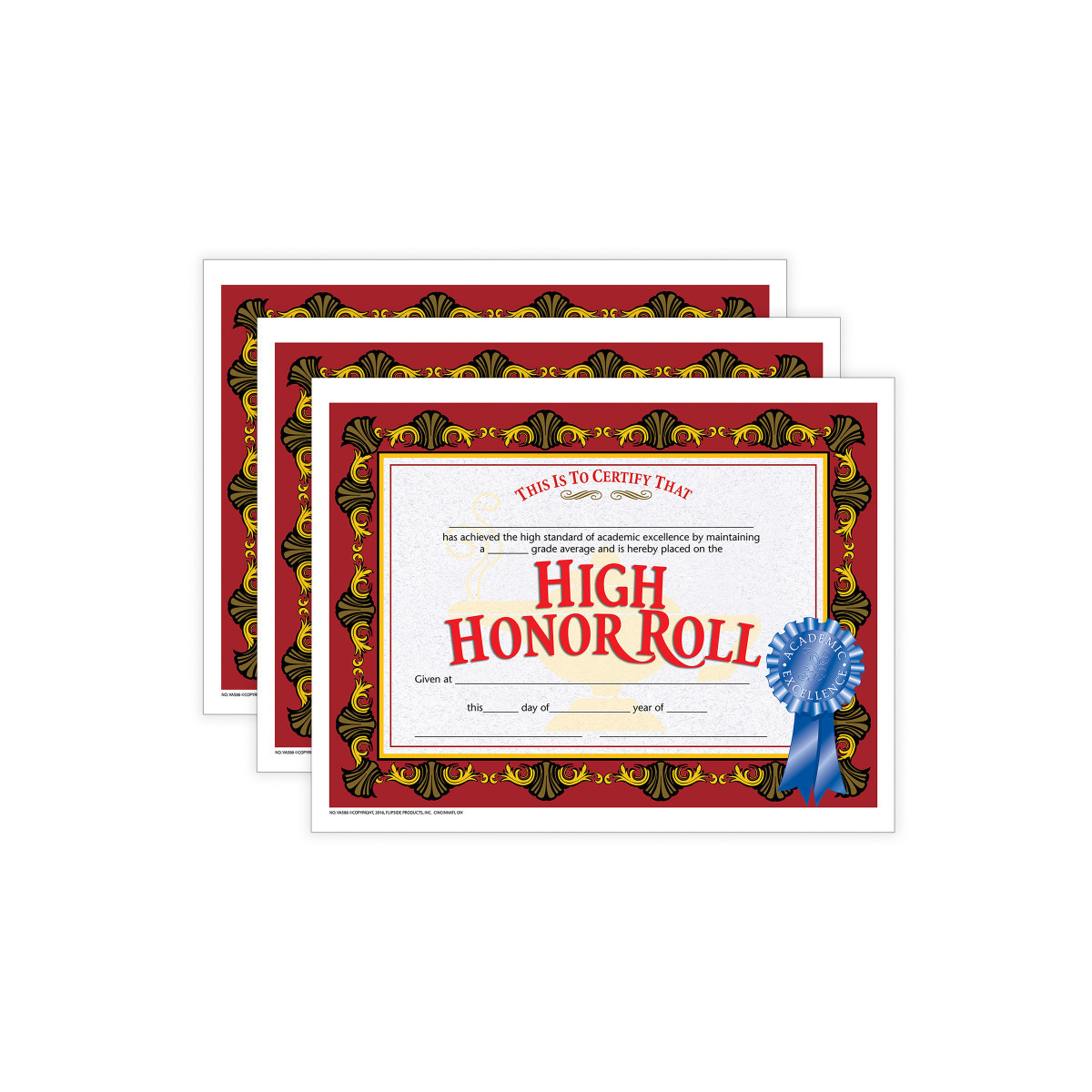 High Honor Roll Certificate awards students who have academic excellence. This Hayes certificate is beautifully designed with a red background. The certificate features a blue Academic Excellence ribbon. These are great to give to students at end of the year parties and award ceremonies. This blank honor roll award can be personalized with the recipient's name and other information pertaining to the award. They can be either handwritten or printed with a downloadable template. Measures 8.5" x 11". Each pack includes 30 certificates. Sold as 3 packs for a total of 90 certificates.