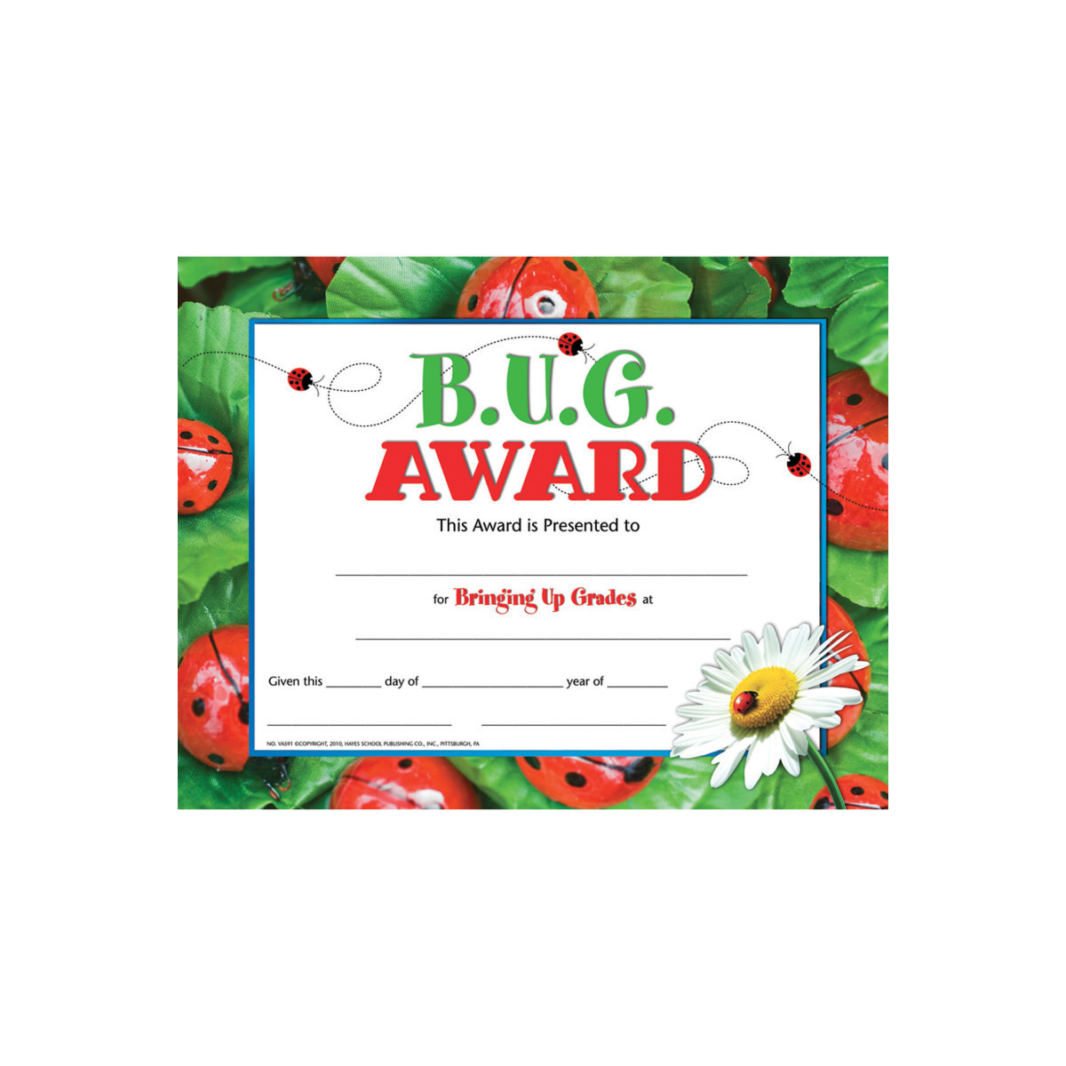 B.U.G. Award Certificate is given to students who have been working hard and have succeeded in bringing up their grades. This Hayes certificate features an images of ladybugs on leaves for it's background. This bringing up grades award is great to give out at end of the school year parties and award ceremonies. This blank Hayes award can be handwritten or printed for personalization. Measures 8.5" x 11". Each pack includes 30 diplomas.