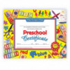 Certificate reads: This certifies that _____ has completed the Preschool course of study and is therefore entitled to this Preschool Certificate Given at _____ this _____ day of _____ year of _____. These certificates can either handwritten or printed using a downloadable templates.
