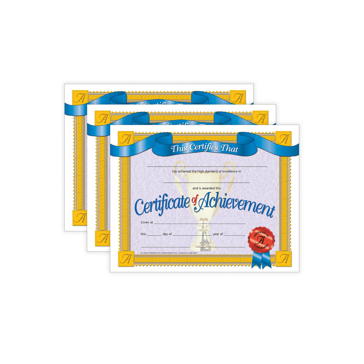 Certificate of Achievement is a great way to reward someone for outstanding work. Hayes student certificates can be personalized with our downloadable template. They are printed in full color on high quality matte paper. Inkjet and laser printer friendly. Great for teachers and principals to give out at end of the school year parties and award ceremonies. Also, great to be used in a work environment. Measures 8.5" x 11". Each pack includes 30 certificates. Sold as 3 packs for a total of 90 certificates.