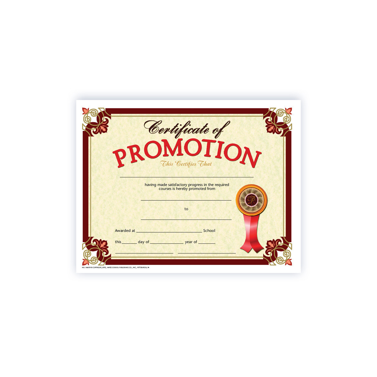 Certificate reads: Certificate of Promotion This certifies that _____ having made satisfactory progress in the required course is hereby promoted from _____ to _____. Awarded at _____ School this _____ day of _____ year of _____.