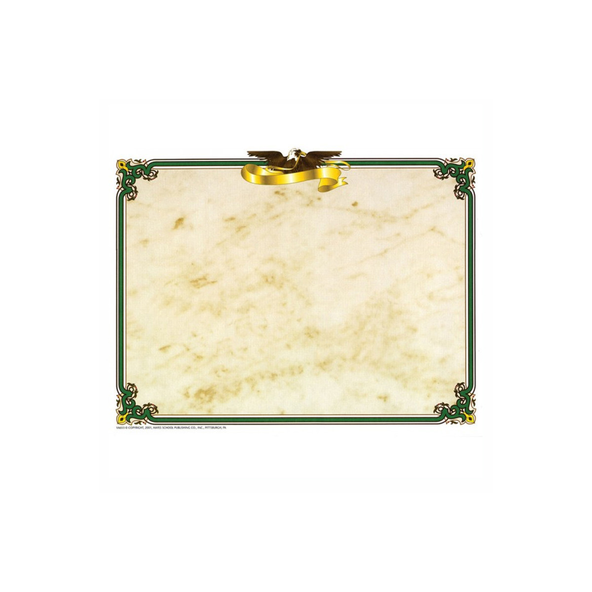 Eagle Border Paper features parchment style paper with an eagle resting on gold ribbon along the top edge. Classic look is finished with green and gold border and ornate corners. Design and create your very own invitation, program, diploma, award or certificate with this original preprinted border and your favorite word processor or page layout program. Our border paper is great for teachers and administrators to use for end of the year certificates and awards. They also make great classroom incentives. Measures 8.5" x 11". Each pack includes 50 sheets.