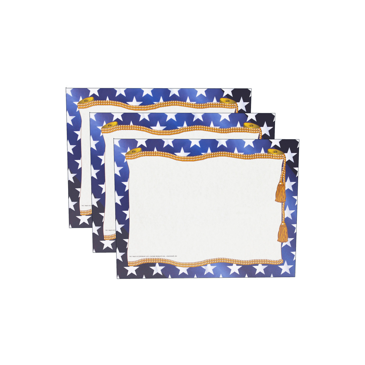 Stars Border Paper features a bold blue with white stars and gold cording and tassels frame around a light parchment center. Design and create your very own invitation, program, diploma, award or certificate with this original pre-printed border and your favorite word processor or page layout program. Border paper can be used as great classroom incentives. The possibilities are endless with our blank border paper. Great for teachers and administrators to use for end of the year awards and certificates for students. Our border paper is printed in full color on high quality paper. This best selling blank paper can be creatively design by hand or printed with a computer program. Measures 8.5" x 11". Each pack includes 50 sheets. Sold as 3 packs for a total of 150 sheets.
