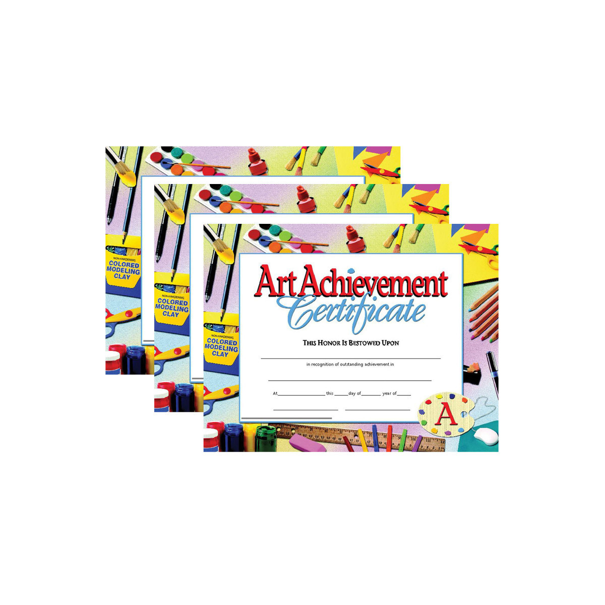 Art Achievement Certificates are a great way to recognize student who have excelled in art class or art club. These authentic Hayes certificates features a multi color background with images of different art supplies scattered throughout the background. These student certificates are printed in full color on high quality paper. They are great for teachers and administrators to give out at end of the school year parties and award ceremonies. These achievement certificates also work great as classroom incentives. Certificates measure 8.5" x 11". Each pack includes 30 certificates. Sold as 3 packs for a total of 90 certificates.