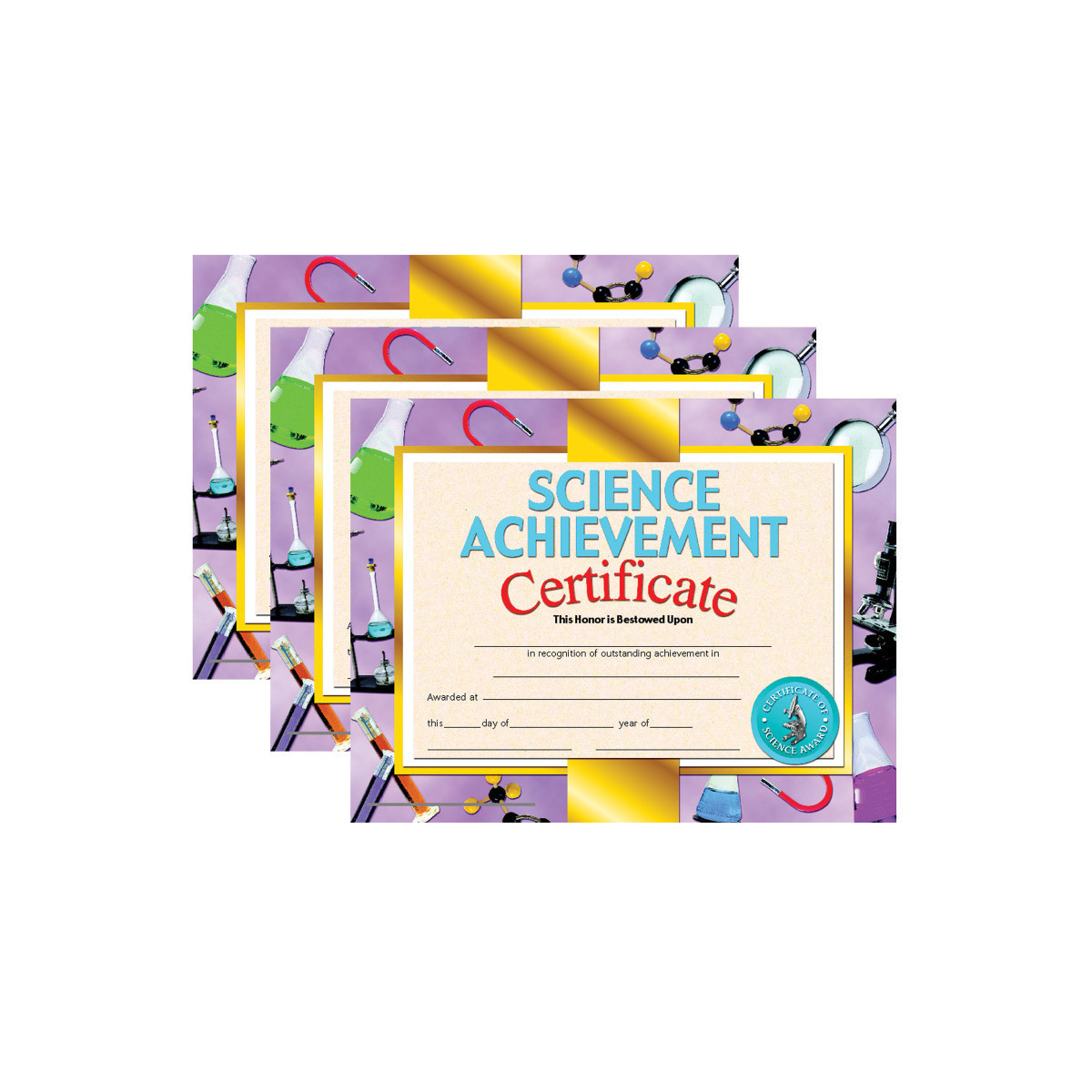Certificate reads: Science Achievement Certificate This Honor is Bestowed Upon _____ in recognition of outstanding achievement in _____ Awarded at _____ this _____ day of _____ year of _____.