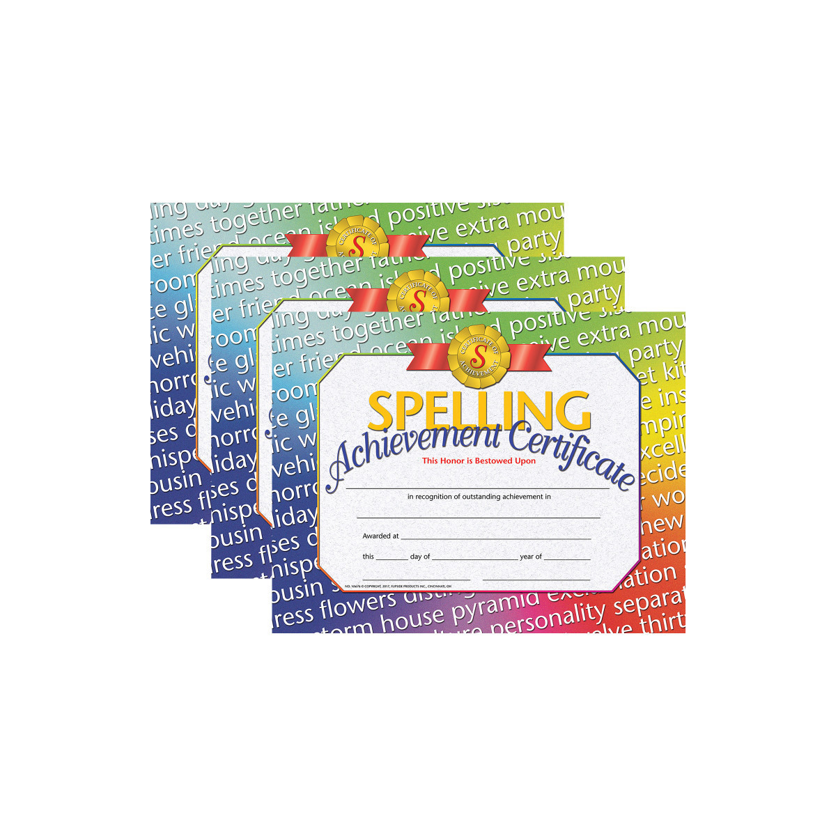 Spelling Achievement Certificate features a rainbow colored background with an assortment of words across the entire background. This authentic Hayes certificate honors students for the hard work and outstanding achievement in spelling. These can also be a great way to reward students for making it into the spelling bee. Perfect for teachers and administrators to give out at end of the year parties and award ceremonies. These student certificates can also be used as a student incentive. They are printed in full color on high quality paper. Certificates measure 8.5" x 11". Each pack includes 30 certificates. Sold as 3 packs for a total of 90 certificates.