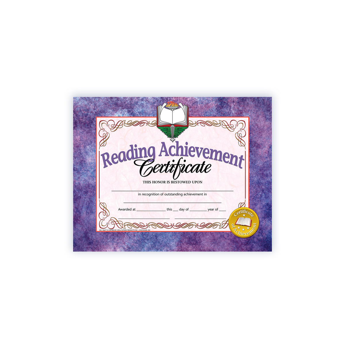 Certificate reads: Reading Achievement Certificate This Honor Is Bestowed Upon _____ in recognition of outstanding achievement in _____ Awarded at _____ this _____ day of _____ year of _____. These blank achievement awards can be personalized with the student's name and other information regarding the award.