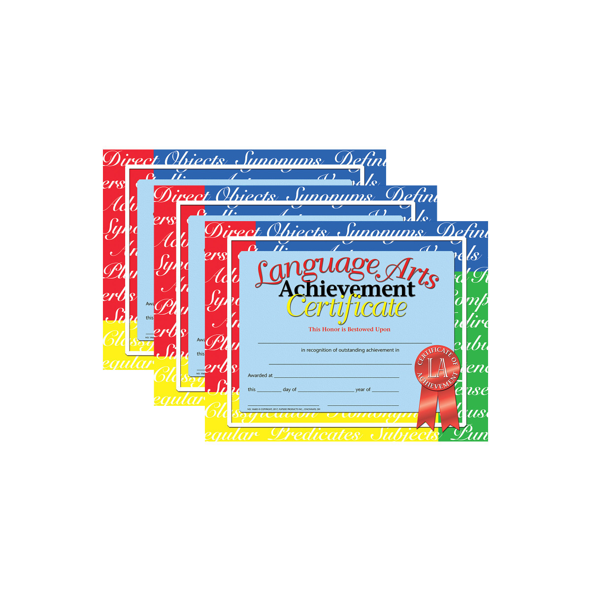 Certificate reads: Language Arts Achievement Certificate This Honor is Bestowed Upon _____ in recognition of outstanding achievement in _____ Awarded at _____ this _____ day of _____ year of _____.