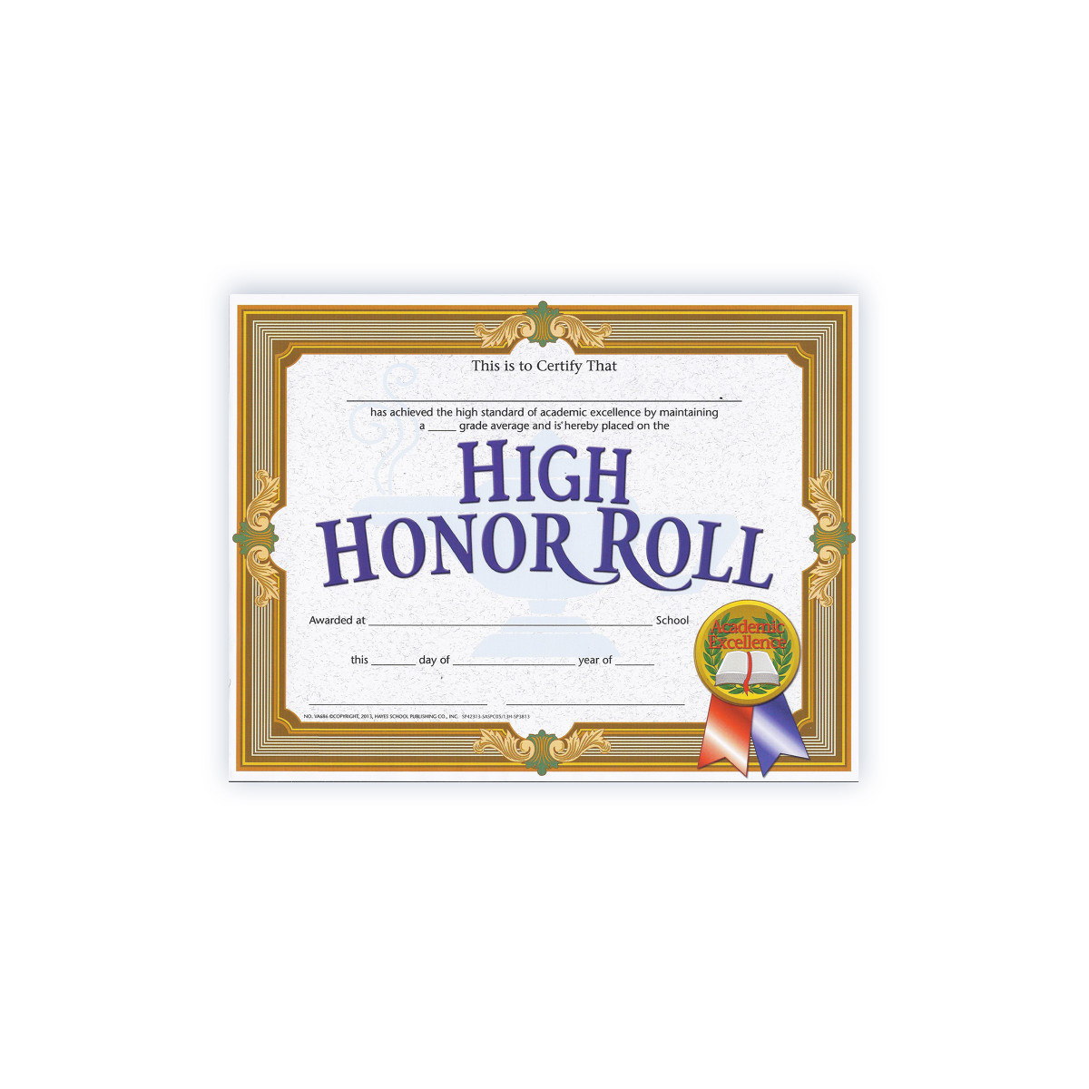 High Honor Roll Certificates are beautifully designed with a regal look. They are authentic Hayes certificates that are printed in full color on high quality paper. These honor roll awards are a great way to award students for their academic achievement. Teachers and administrators can give these out at end of the school year parties and award ceremonies. The certificates can be handwritten or printed by using a downloadable template. Measures 8.5" x 11". Each pack includes 30 diplomas.