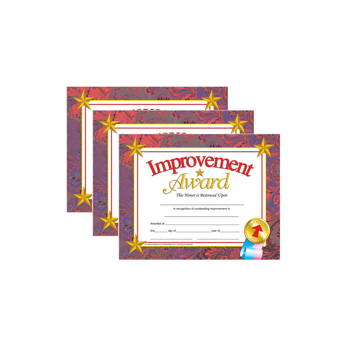 Improvement Award Certificates are beautifully designed Hayes certificates. They are a great way to recognize students who have been working hard at bringing up their grades. These student certificates are printed in full color on high quality paper. Great for teachers and administrators to give out at end of the year parties and award ceremonies. They can also be used as student incentives. The certificates can be personalized with our downloadable template. Inkjet and laser printer friendly. Each individual pack contains 30 certificates and measure 8.5" x 11". Sold as 3 packs, 90 certificates total.