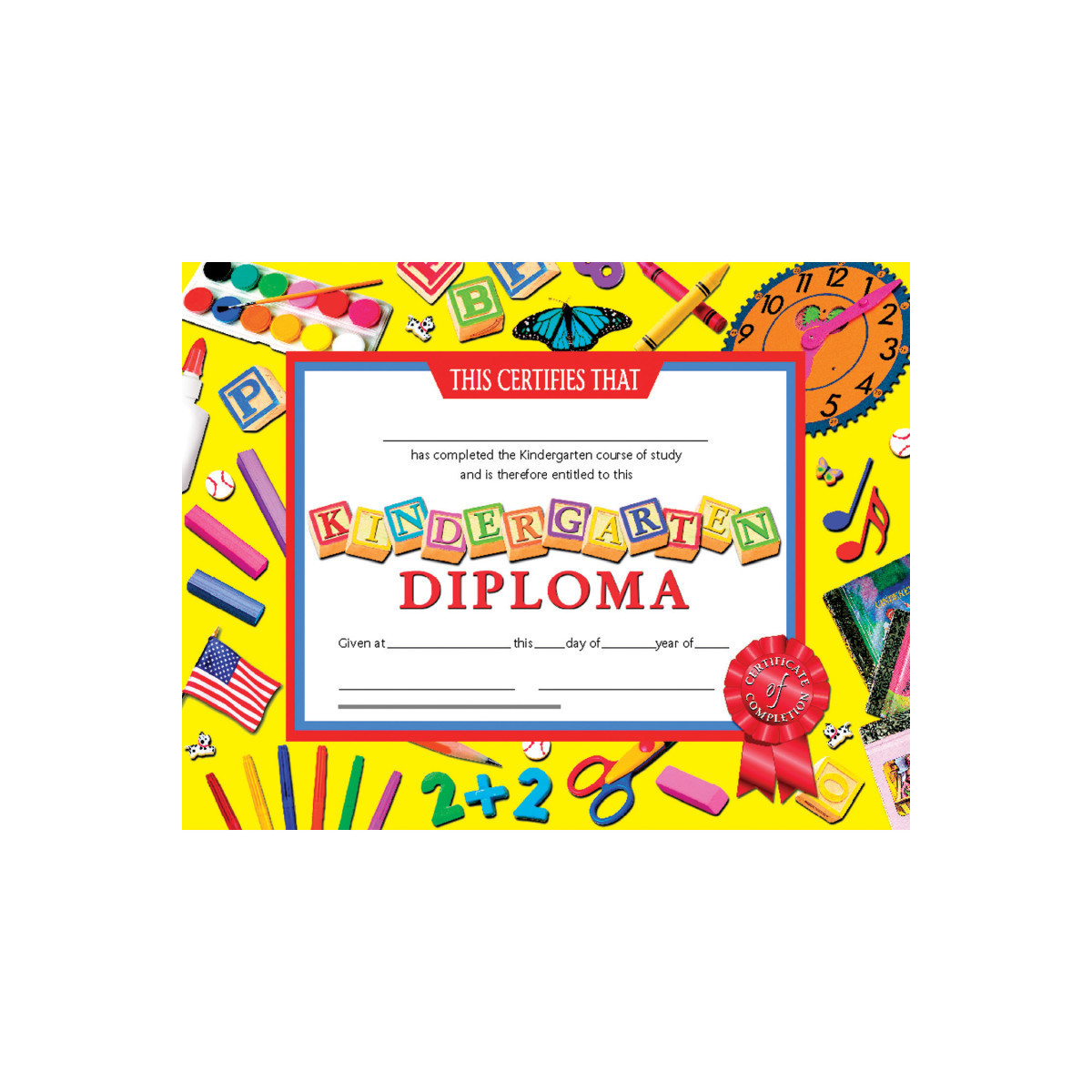 Diploma reads: This certifies that _____ has completed the Kindergarten course of study and is therefore entitled to this Kindergarten Diploma. Given at _____ this _____ day of _____ year of _____.