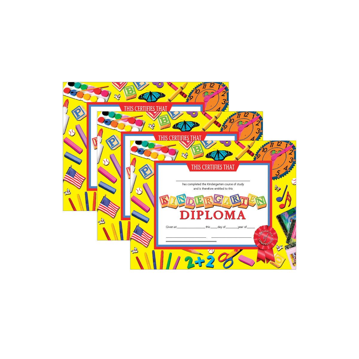 Kindergarten Diplomas award students for completing kindergarten. These Hayes diplomas have a fun yellow primary themed border. They are printed in full color on high quality paper. Great to give out at graduations, end of the school year parties, and award ceremonies. The diplomas will become a keepsake for years to come. These student diplomas can be personalized with the student's name, school's name, and the date of graduation. The certificates can be handwritten or printed by using a downloadable template. Measures 8.5" x 11". Each pack includes 30 diplomas. Sold as 3 packs for a total of 90 diplomas.
