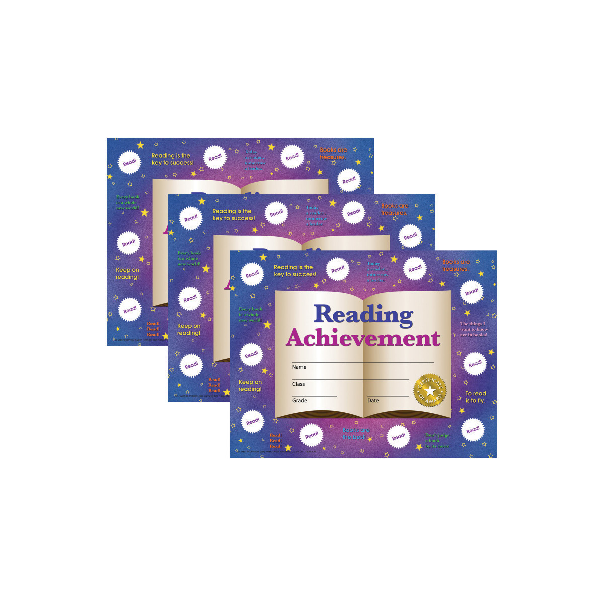 Reading Achievement Certificates and Reward Seals Combination Pack are a great way to promote reading among students. These student certificates are beautifully designed and they are printed in full color on high quality matte paper. Stick-to-it certificates are great motivators because students get to keep track of their progress and have a goal to work towards. The certificates can be personalized with our downloadable template. They can be printed or handwritten. Certificates are inkjet and laser printer friendly. Certificates measure 8.5" x 11". Each pack includes 30 certificates, 320 reward seals, and an instructor's guide. Sold as 3 packs for a total of 90 certificates and 960 reward seals.