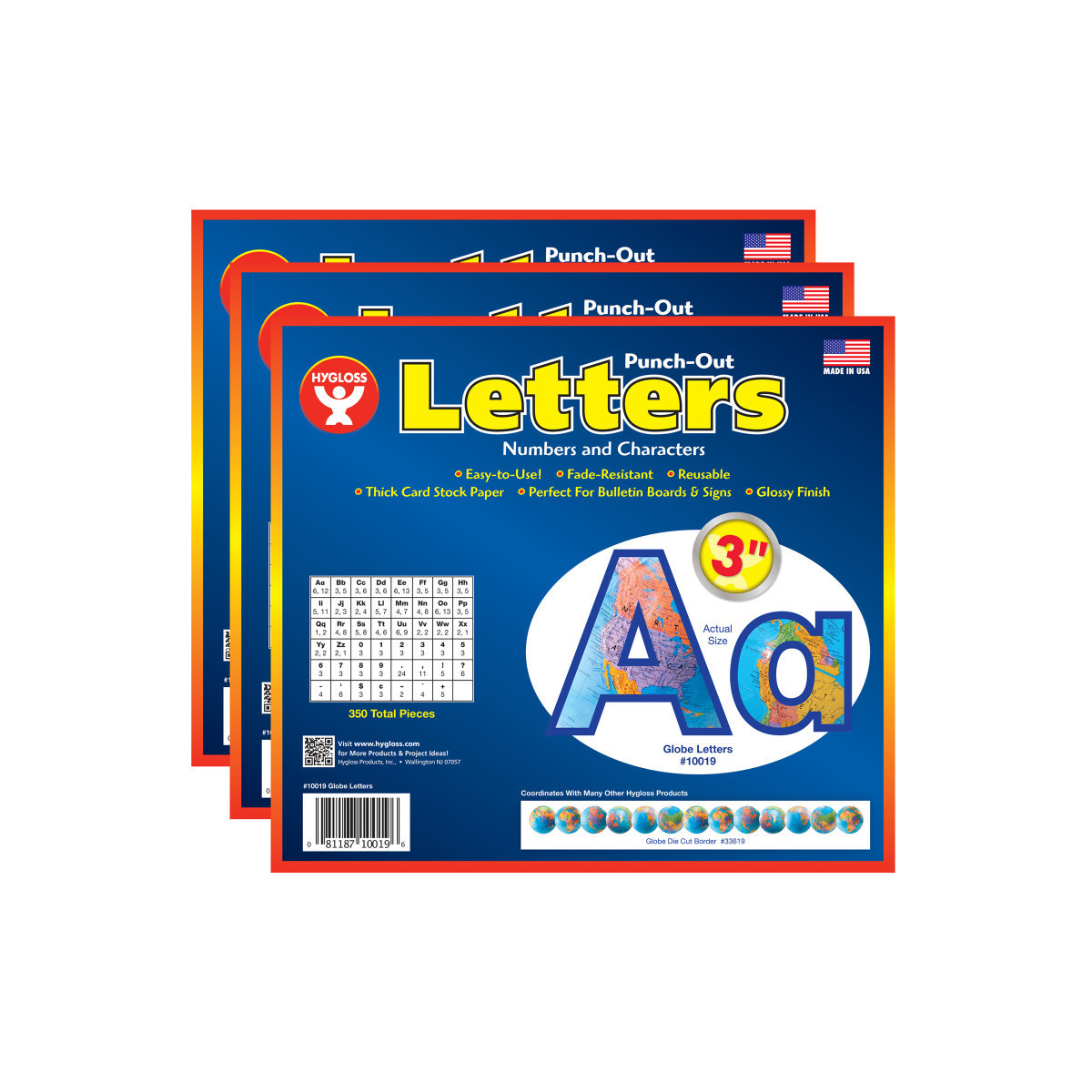 Hygloss Globe Punch-Out Letters make it simple to decorate your bulletin board or classroom with amazing results. Easily fill your classroom walls and bulletin boards with a colorful spectrum of beauty and excitement. Uppercase letters and numbers are 3 inches tall while lowercase letters measure approximately 2 inches tall. They are printed on premium quality card stock with a glossy multi-color-design finish, making them durable and easy to use. For a super-coordinated classroom, check out our entire line of GLOBE THEMED PRODUCTS. Each pack contains 350 characters. Sold as 3 packs for 1050 characters total.