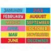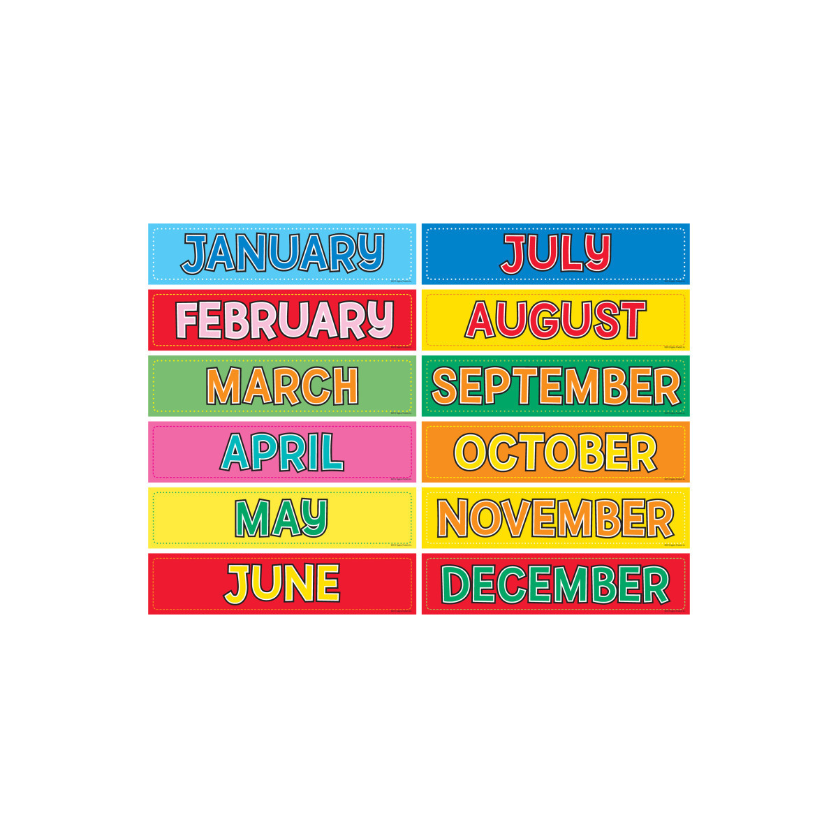 These monthly calendar cards come in brightly colored strips with the month names clearly printed on each card to help students identify the months contained in the calendar year.