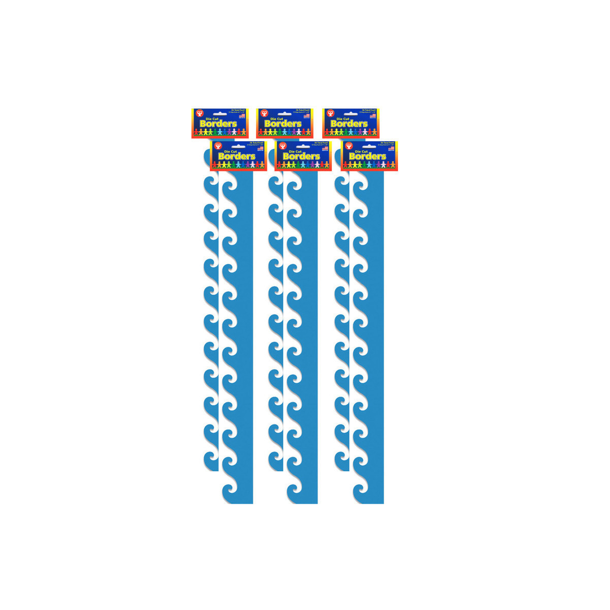 Our classroom borders blue waves border trim will liven up bulletin boards, windows and walls. Summers coming? Promote classroom themes, establish moods and teach new concepts with blue waves bulletin board borders. Each strip measures 3" x 36". Each pack includes 12 strips for a total of 36'. Sold as 6 packs for a total of 216 feet of board trimmers.