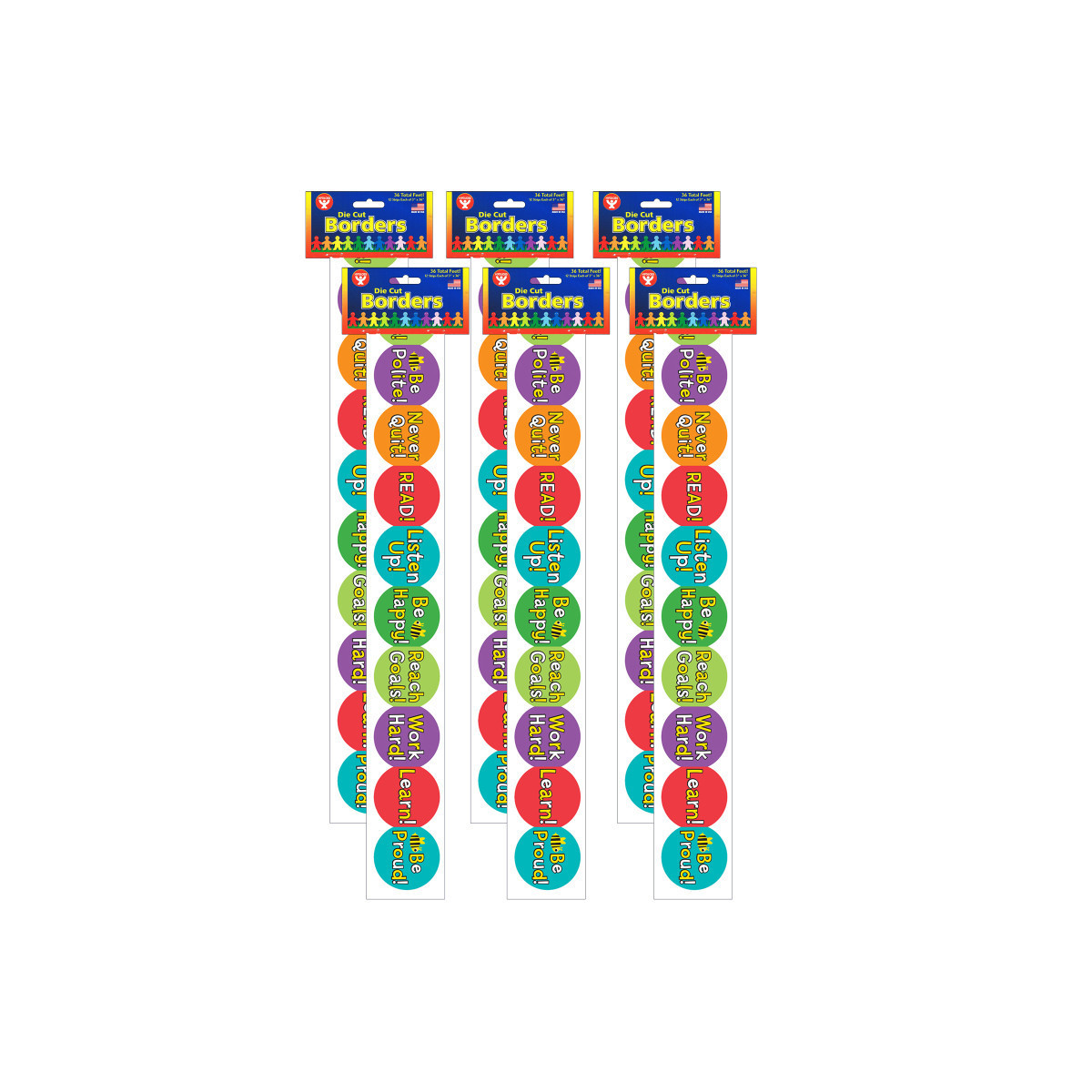 Be Your Best is the positive theme of these engaging bulletin board borders. Your students will be inspired with messages such as never quit, study hard, help others and be happy while they look at their classroom bulletin boards and walls. Strips measure 3" x 36". Each pack includes 12 strips for a total of 36 feet of border. Sold as 6 packs for a total of 216 feet of border.