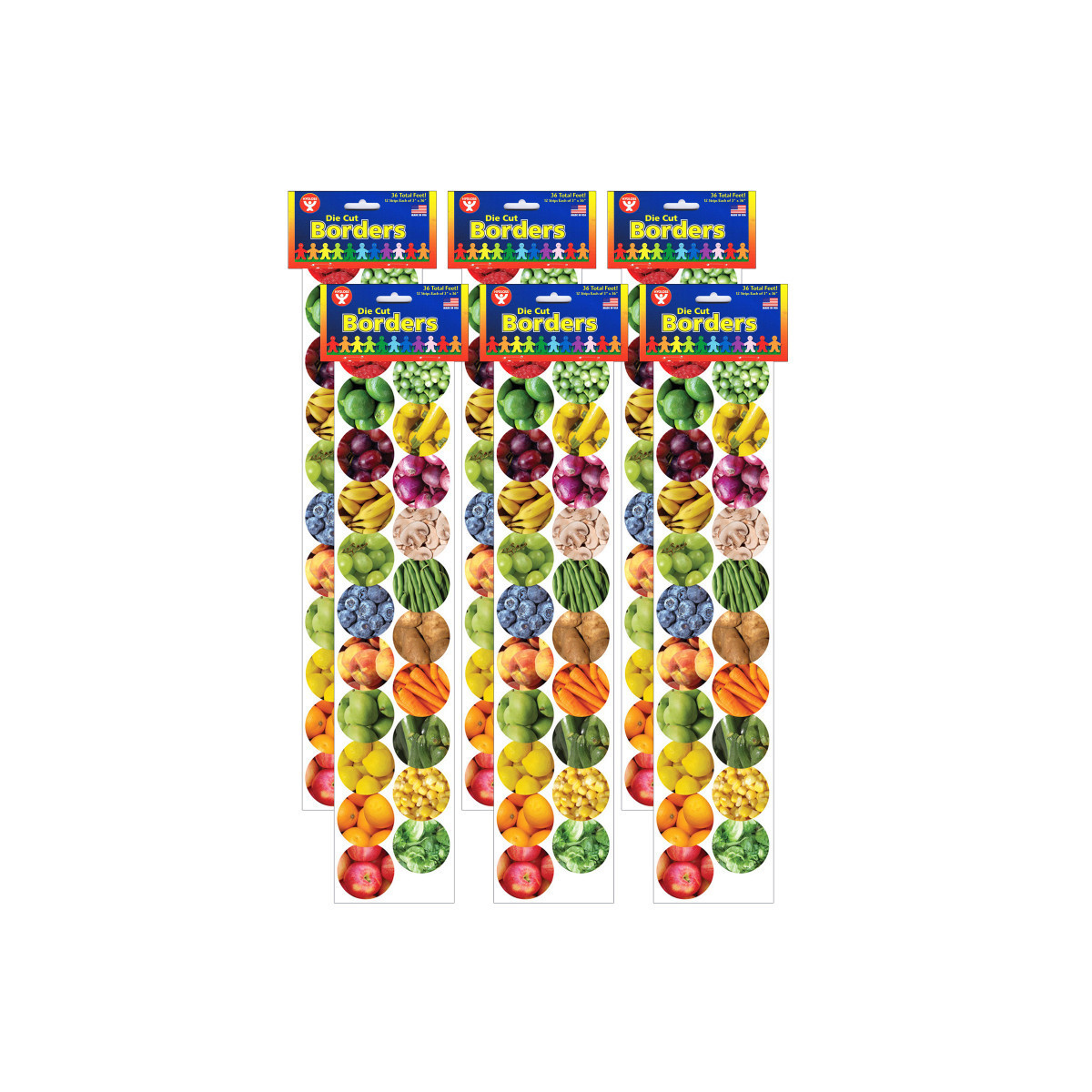 Teach healthy eating to children with the Hygloss Classroom Fruits & Veggies Border, and have your students flock to their refrigerators to eat tasty red apples, or crunchy green cucumbers as soon as they get home from school. These classroom borders have rows of yummy blueberries, grapes, bananas and other fruits, as well as rows of sliced mushrooms, fresh string beans, peas and more, to help you teach your students about the great qualities of nature's fruits and vegetables. Strips measure 3" x 36". Each pack includes 12 strips, 6 each of fruits and vegetables, for a total of 36 feet of border. Sold as 6 packs for a total of 216 feet of border.