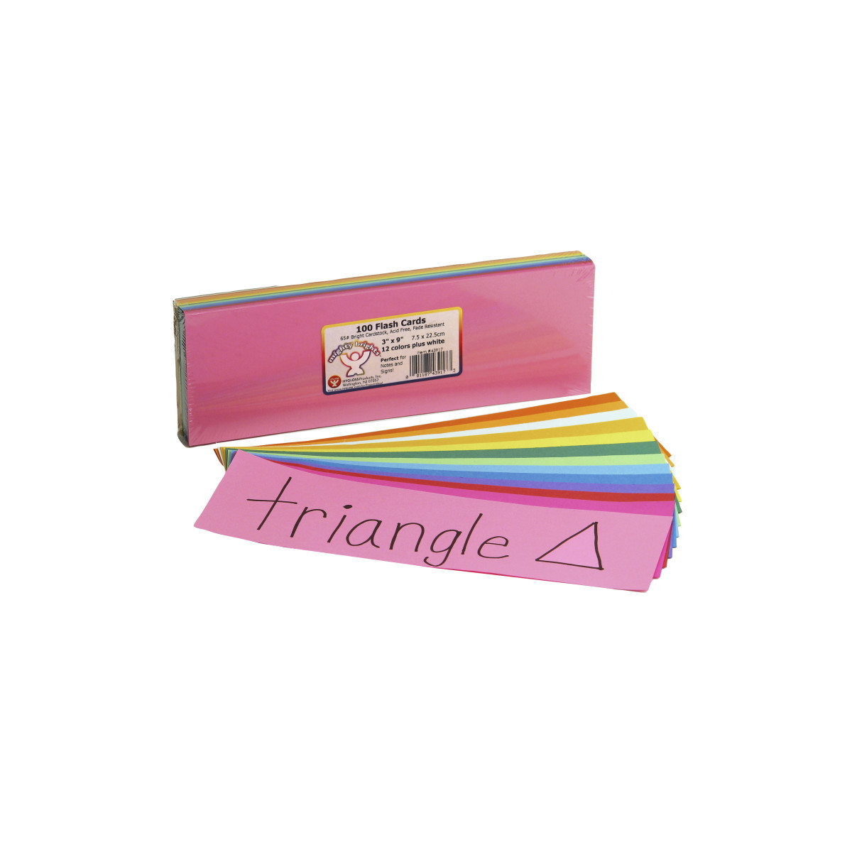 Each pack includes 100 cards, 8 each of 12 colors and 4 white, measuring 3" x 9".