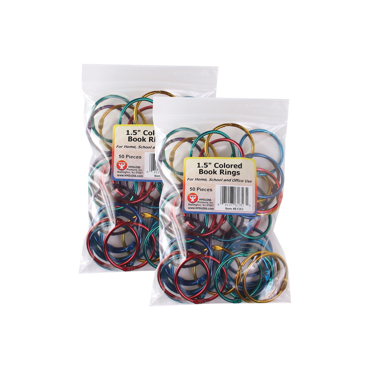 Book rings are the sure fast method of keeping things together. These binding rings are made with smooth and tough steel coating that ensures that your binder rings won't crack or chip. Durable metal book rings can be used for a huge assortment of projects as well as conveniences around the home and classroom. That's right, book rings are not just good supplies for the office anymore. Make fun and user-friendly projects such as calendars, fabric swatch holders, mini scrapbooks, key rings and recipe books using these nifty binder rings. Binding rings are just the right things for creating your very own motion and flip books, and rings that bind are perfect for projects such as baby books or scrapbooks because they offer the flexibility and room for adding more pages in the future. Use your sturdy binding rings to hang up signs and notices or even to keep important papers, game pieces or scraps together. The easy to open clasp mechanism is equally simple to close, and, yet, locks securely and holds strong every time. A rust free metal book ring from Hygloss is meant to last through heavy duty usage and can stand up to wear and tear. Rings measure 1.5" and come in unique metallic colors. Each pack includes 50 rings. Sold as 2 packs for a total of 100 rings.