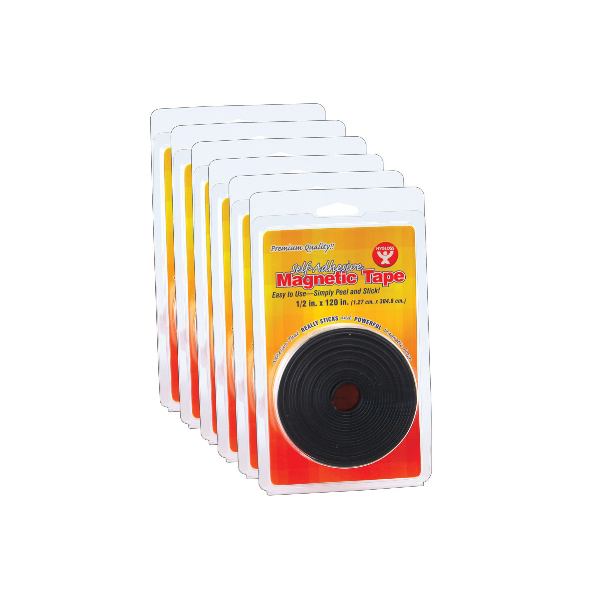 A must have for every home and classroom, Hygloss Self-Adhesive Magnetic Tape is perfect for allowing almost anything to stick to a metal surface like a desk, dry-erase board, locker or refrigerator. With Hygloss self-adhesive Magnetic Tape, the possibilities are endless! Cut to any size, then peel and stick to virtually any material: wood, metal, paper or plastic, to turn all your kids crafts into decorations for any magnetic surface. You can also use it to hang business cards or notices on the refrigerator. Teaching is made easy with magnetic tape; attach a strip of magnet to word strips or classroom decorations to easily display on a dry erase board. Hygloss Self-Adhesive Magnetic Tape provides the ultimate combination of fun, educational and convenient! Each roll measures 0.5" x 120". Sold as a pack of 6 rolls.