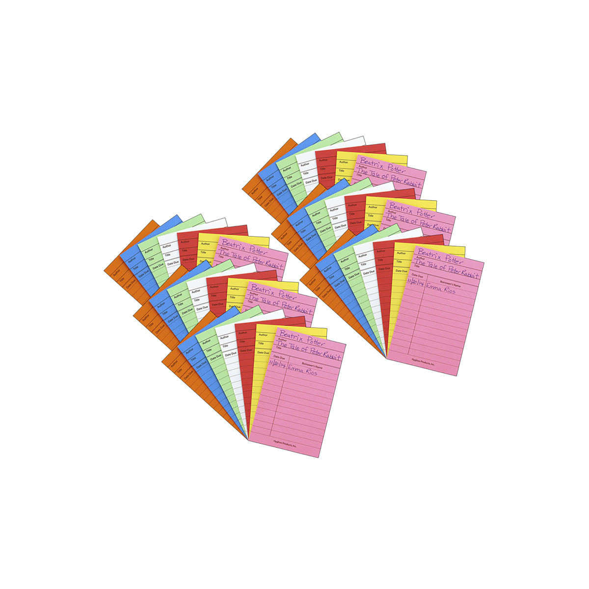 Our Assorted Colored Library Checkout Cards, made of sturdy card stock paper, fit perfectly into our Mighty Bright Library Pockets or Manila Library Pockets (sold separately). They are designed to make your home or school lending library neat and organized. Each pack includes 50 cards. Sold as 6 packs for a total of 300 cards.