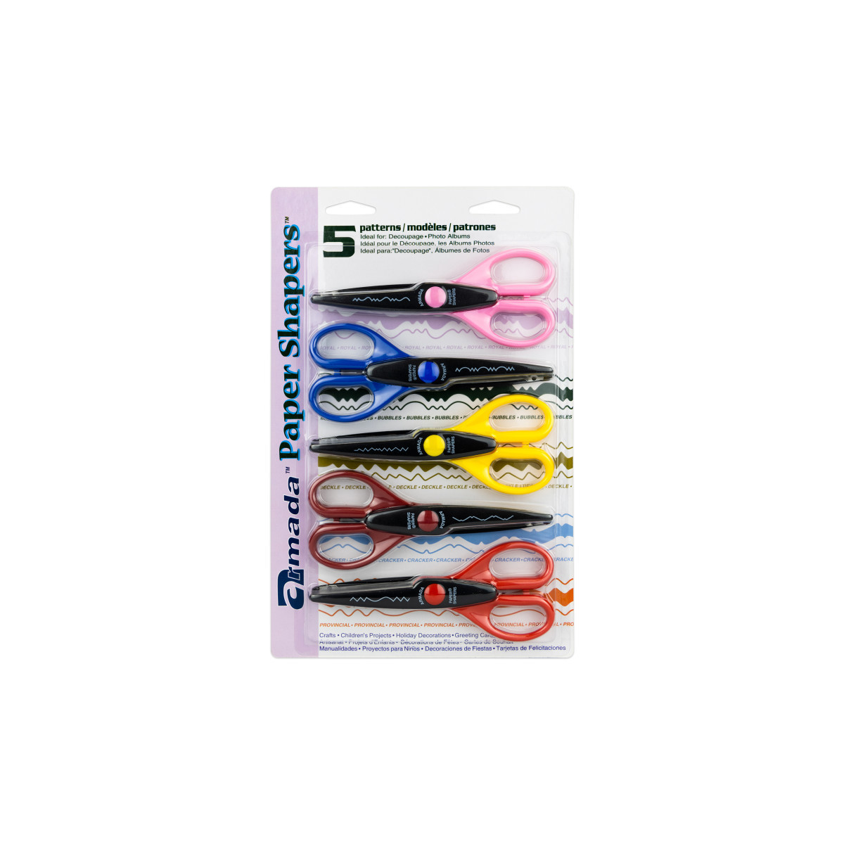 Paper Shaper® decorative scissors will cut unique shapes and borders. They are great for scrapbooks, stationery, paper crafting, and much more! Paper Shapers are made with comfortable and sturdy molded plastic handles and have stainless steel blades. This set comes in a blister pack with 5 designs: Deckle, Cracker, Provincial, Bubbles and Royal.