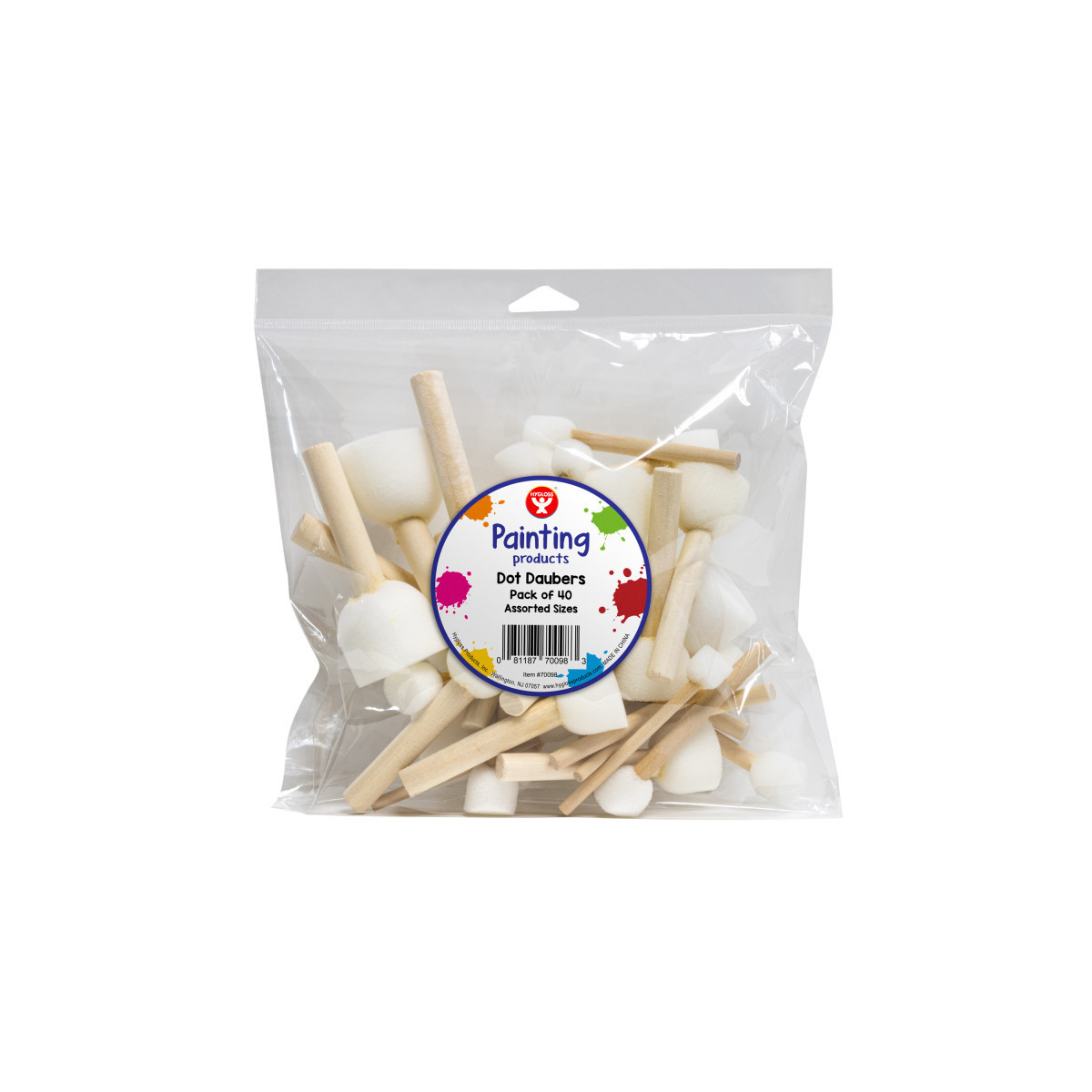 These high quality dot paint brushes come in 4 sizes. They have wooden handles and foam sponge tips, making them fully washable and reusable. Perfect for both young and old, you can have the perfect tool for making dots on your next project. They are ideal for invitations, card making, bulletin board displays, scrapbooking & many other fun crafts. Just dip into the paint of your choice and dot away! Create dots in the following sizes: 5/8", 3/4", 1 1/8", 1 5/8". Each pack includes 40 paint brushes, 10 each of 4 sizes.