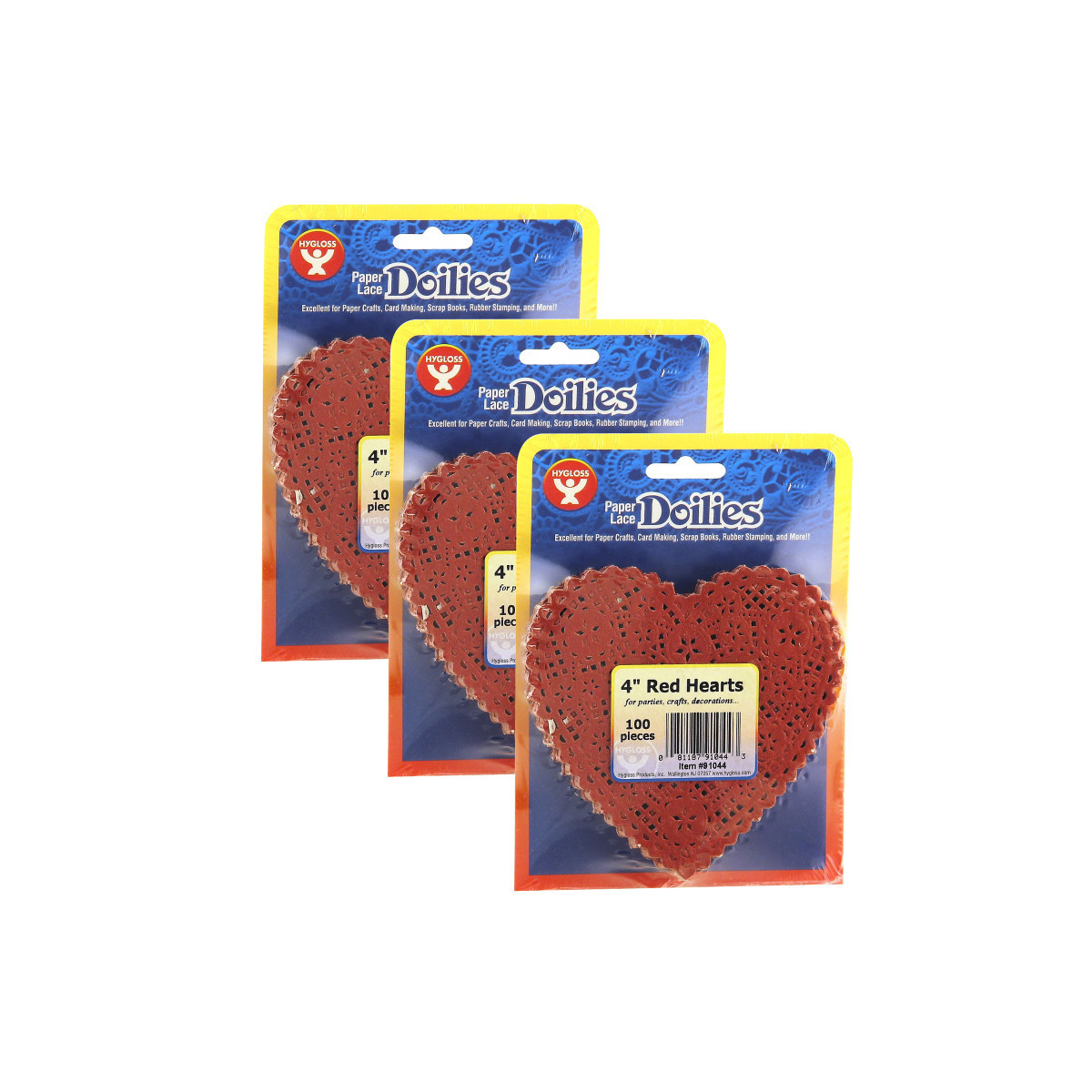 Our heart doilies can be used to make holiday greeting cards for Mothers Day, Valentines Day, and anniversaries. Paper doilies are also unique for creating elegant invitations for special occasions such as parties, graduations and dinners. Use our decorative heart doilies for crafts projects, table settings, card making and other projects where hearts will add warmth and color. Doilies measure 4". Each pack includes 100 doilies. Sold as 3 packs for a total of 300 doilies.