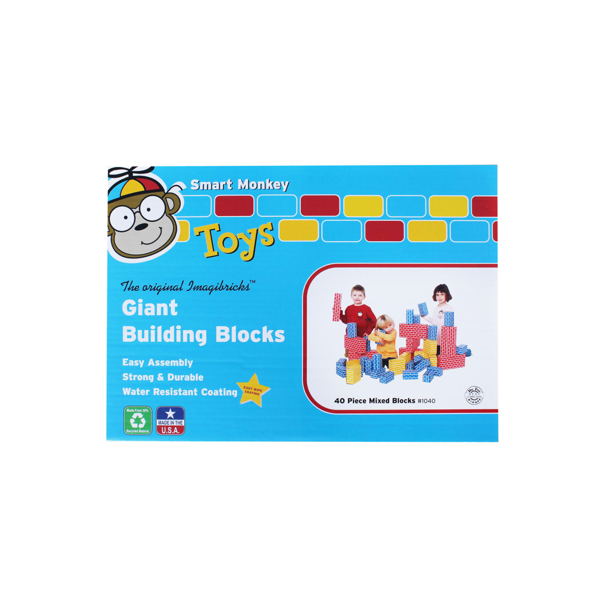 Basic 40pc Block set (assorted sizes and colors). Award-winning ImagiBRICKS™ Giant Building Blocks are an enduring classic that offer endless play possibilities because they are versatile (build with them, jump over them, crash into them) and safe. Constructed of lightweight corrugated cardboard, if the blocks tumble, no one gets hurt! The blocks are printed with non-toxic inks and with their water-resistant coating are strong and durable for years of creative play. Because Imagibricks are unit blocks , they can even be used to teach basic math skills. The blocks come in three sizes and colors and are available in various sets: the large red brick is 12 x 6 x 3 inch, the medium yellow brick is 6 inch x 6 inch x 3 inch, the small blue brick is 6 inch x 3 inch x 3 inch.