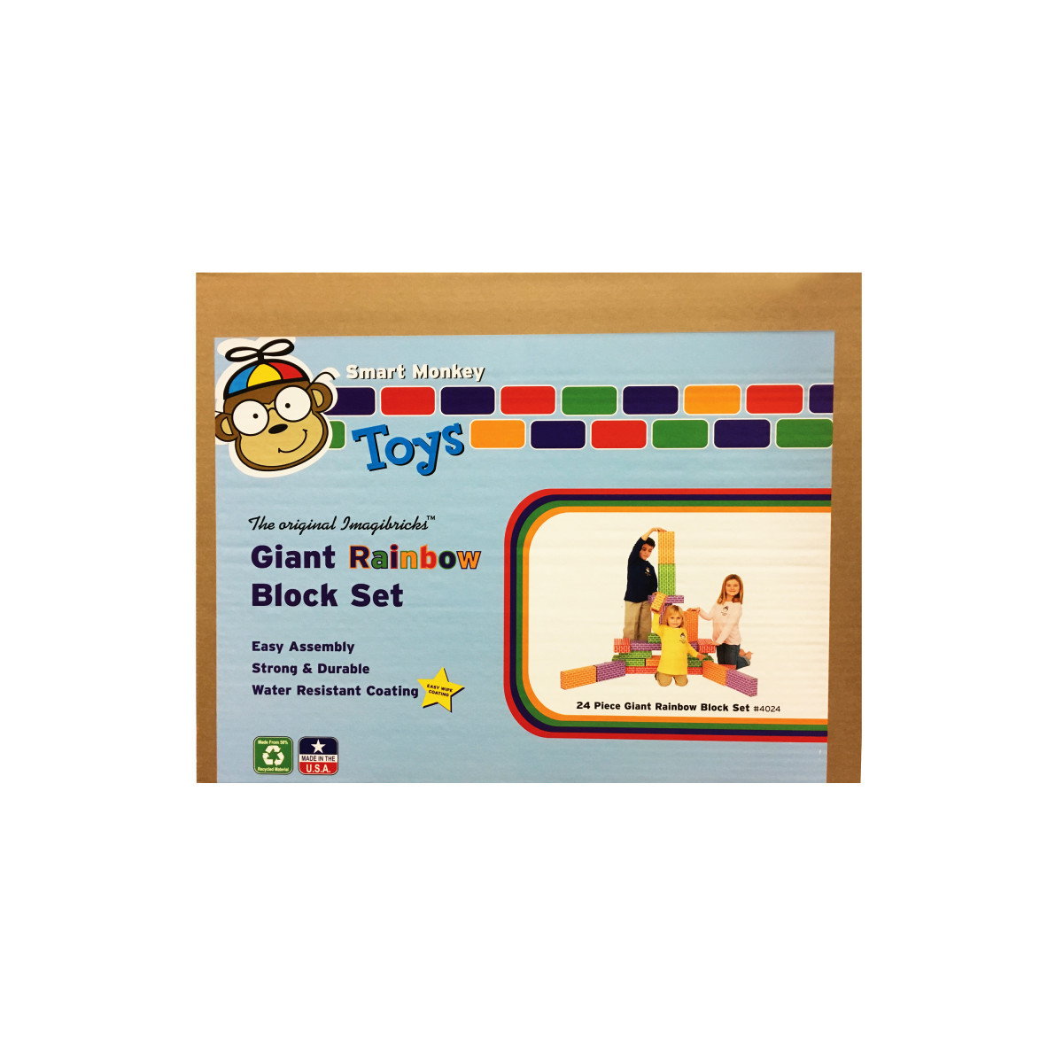 Award-winning ImagiBRICKS™ Giant Building Blocks are an enduring classic that offer endless play possibilities because they are versatile (build with them, jump over them, crash into them) and safe. Constructed of lightweight corrugated cardboard, if the blocks tumble, no one gets hurt! Because these blocks are large, they'll help your child gain confidence, and encourage social play. The blocks are printed with non-toxic inks and with their water-resistant coating are strong and durable for years of creative play. Ages 18 mos.+. Adult assembly required. 24pc set includes: 6 red, 6 green, 6 orange, and 6 purple. 24 large blocks (12" x 6" x 3").