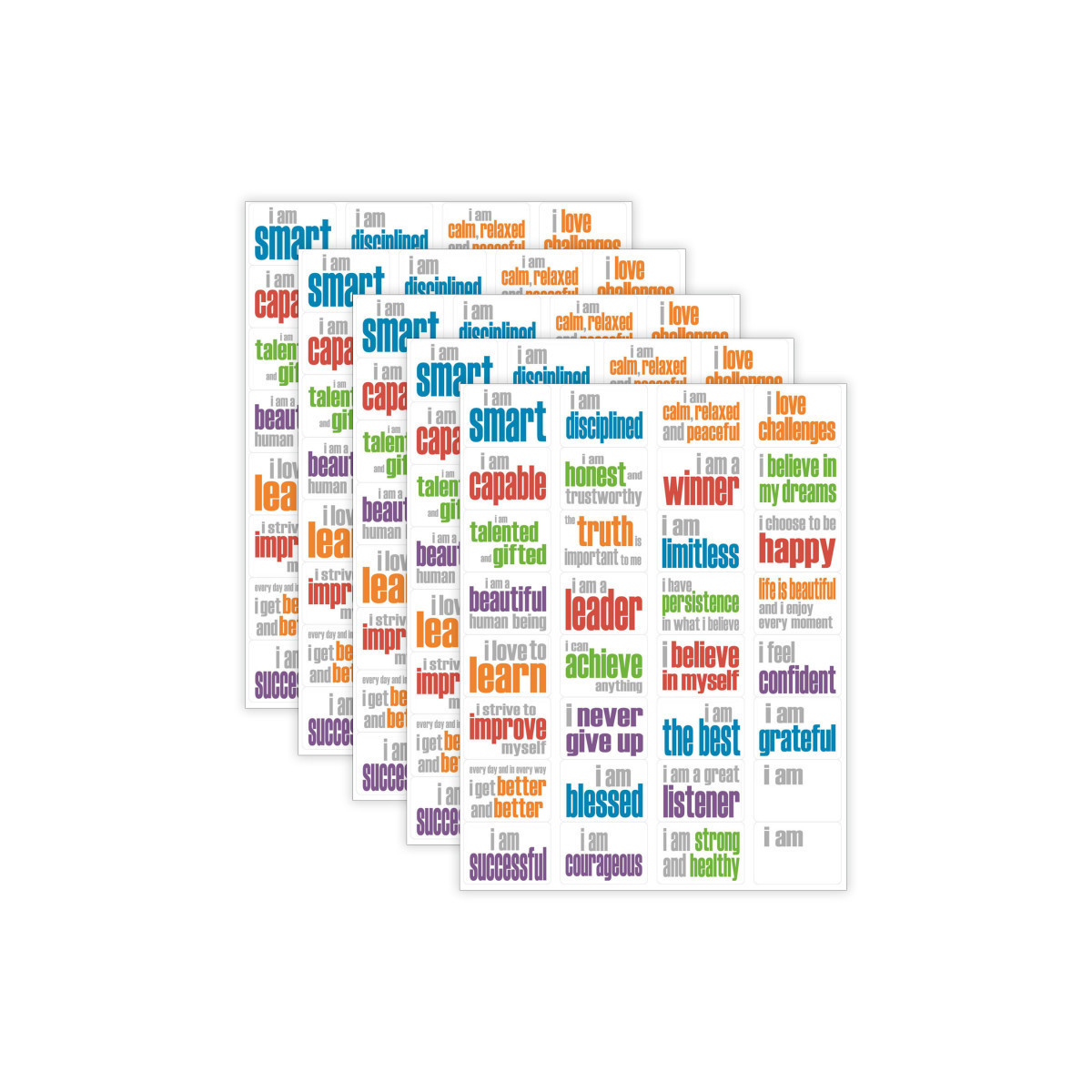 Say it! Think it! Live it! Build encouragement and a positive self-image when displaying and reading these uplifting and to-the-point statements brightly printed on large glossy stickers! 160 Large Glossy Stickers perfect for all ages! Whether used as an incentive or an award, or simply a positive nudge in the right direction, Inspired Minds motivational stickers are the way to go! Stickers measure 1.75" x 1.25". Each pack includes 160 stickers, 32 stickers per sheet, 5 sheets with 2 extra “write-in" stickers per sheet.