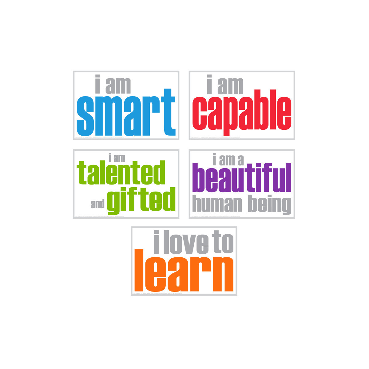 Inspired Minds Poster Booster Sets are intentional printed simple, yet colorful, to offer an impactful and creative way for teachers to help children gain self-esteem and build character for a successful and fulfilling life. Being surrounded by affirmations on a daily basis will build a positive belief system to last a lifetime. Posters measure 11" x 17". Pack of 5.